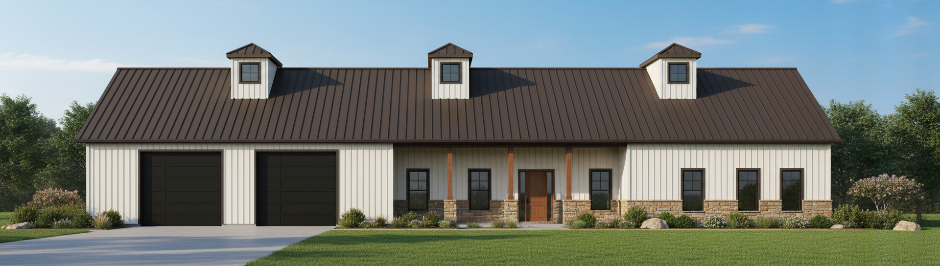 do not change anything from the elevation provided the siding of the barn is warm white color paired with a dark brown metal roof the windows are black to provide a nice contrast the front door is a rich stained brown color that matches the wood columns on the front porch the stone is a mix of grey and brown the 3 garage doors on the left are black with no windows the overall background of the home is spring day on land