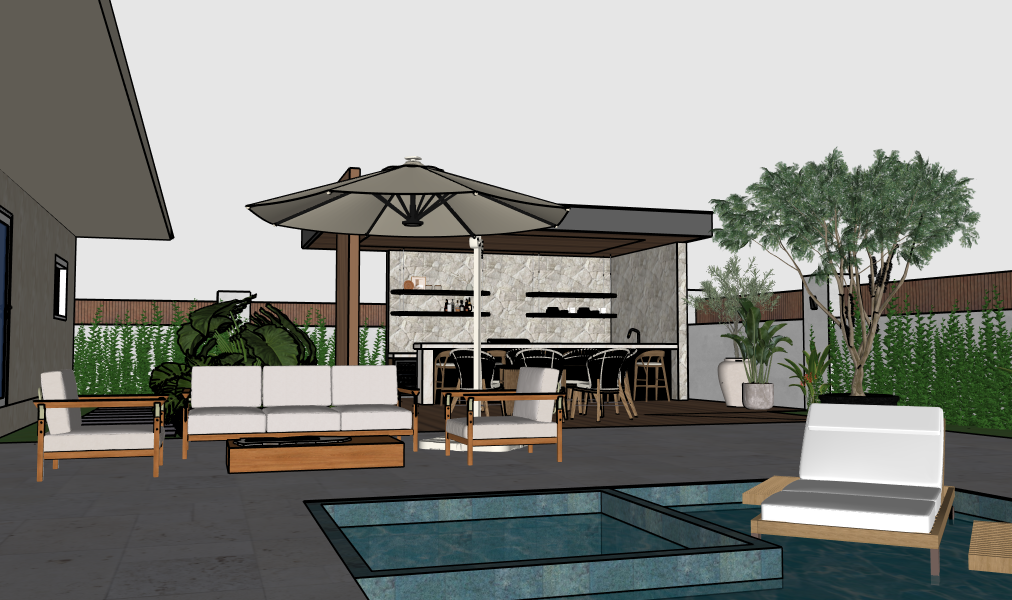 mantenha as texturas originais adicione paisagismo no fundo apos o muro de divisa com arvores grandes