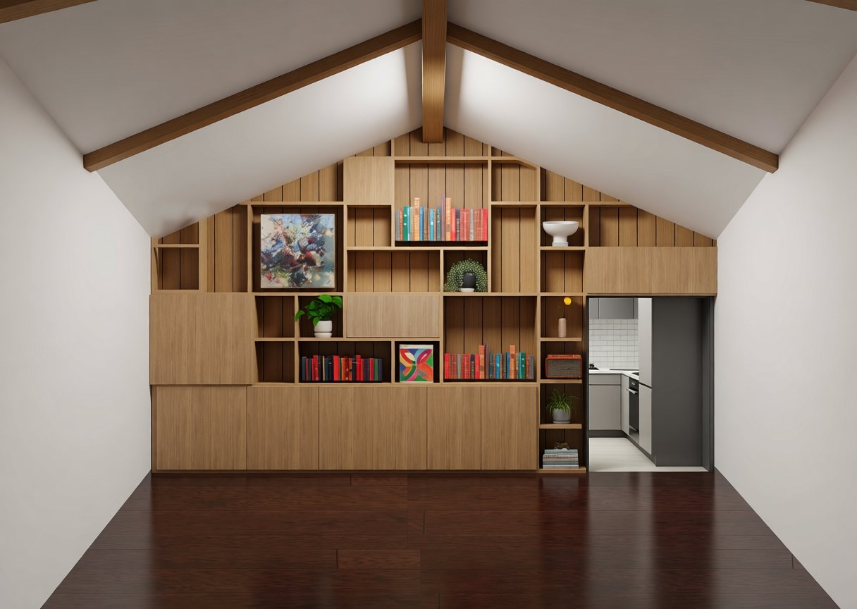 modernist exterior shot keep wood cabinets keep dark flooring make back wood wall panels white all else is the same architecture