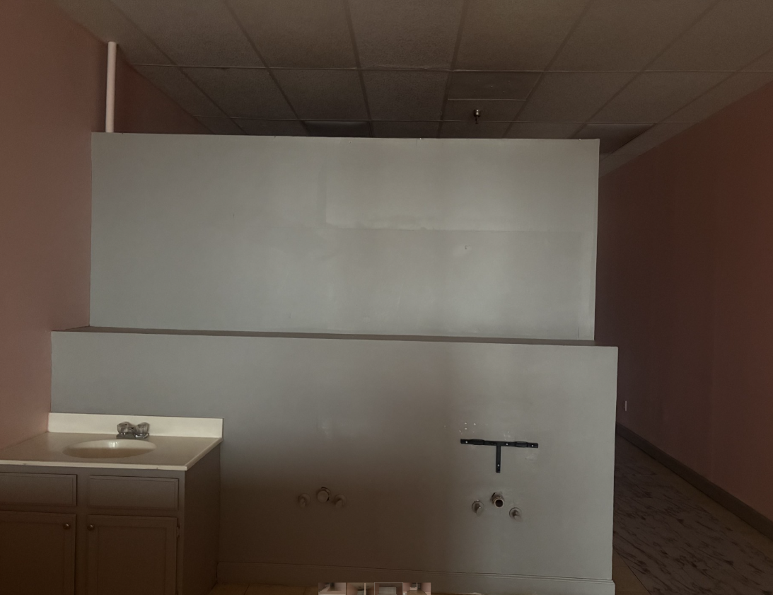 create a light breeze modern uk hairdressing backwash area with 2 salon backwash units with green upholstery the walls decorated in a complementary earthy lime wash finish keep existing ceiling but have modern daylight grid down lighters keep the same camera view