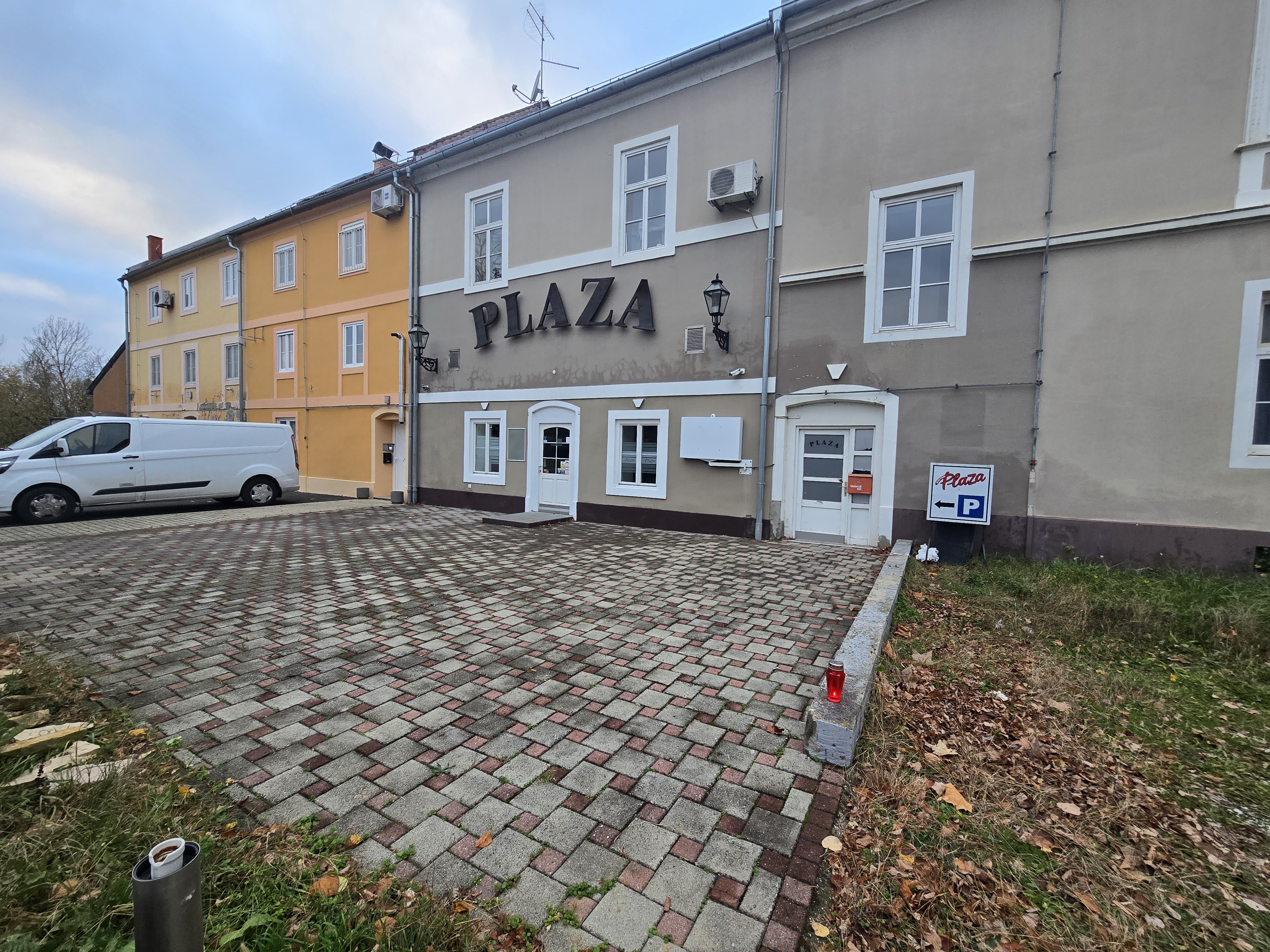 add a covered pergola to the paved red and white area in front of the building door and window with outdoor tables for the restaurant with modern flower pots
