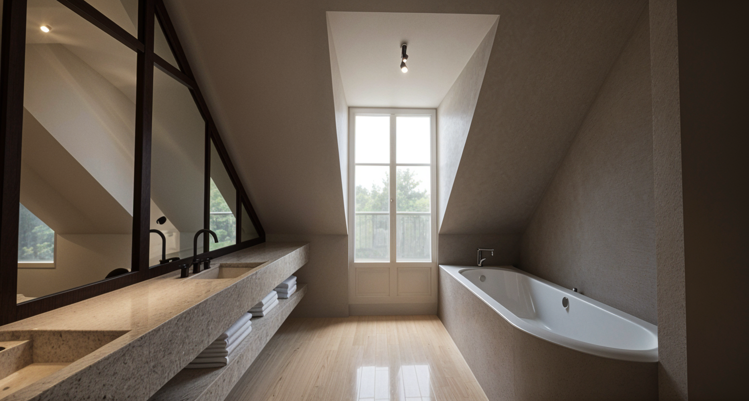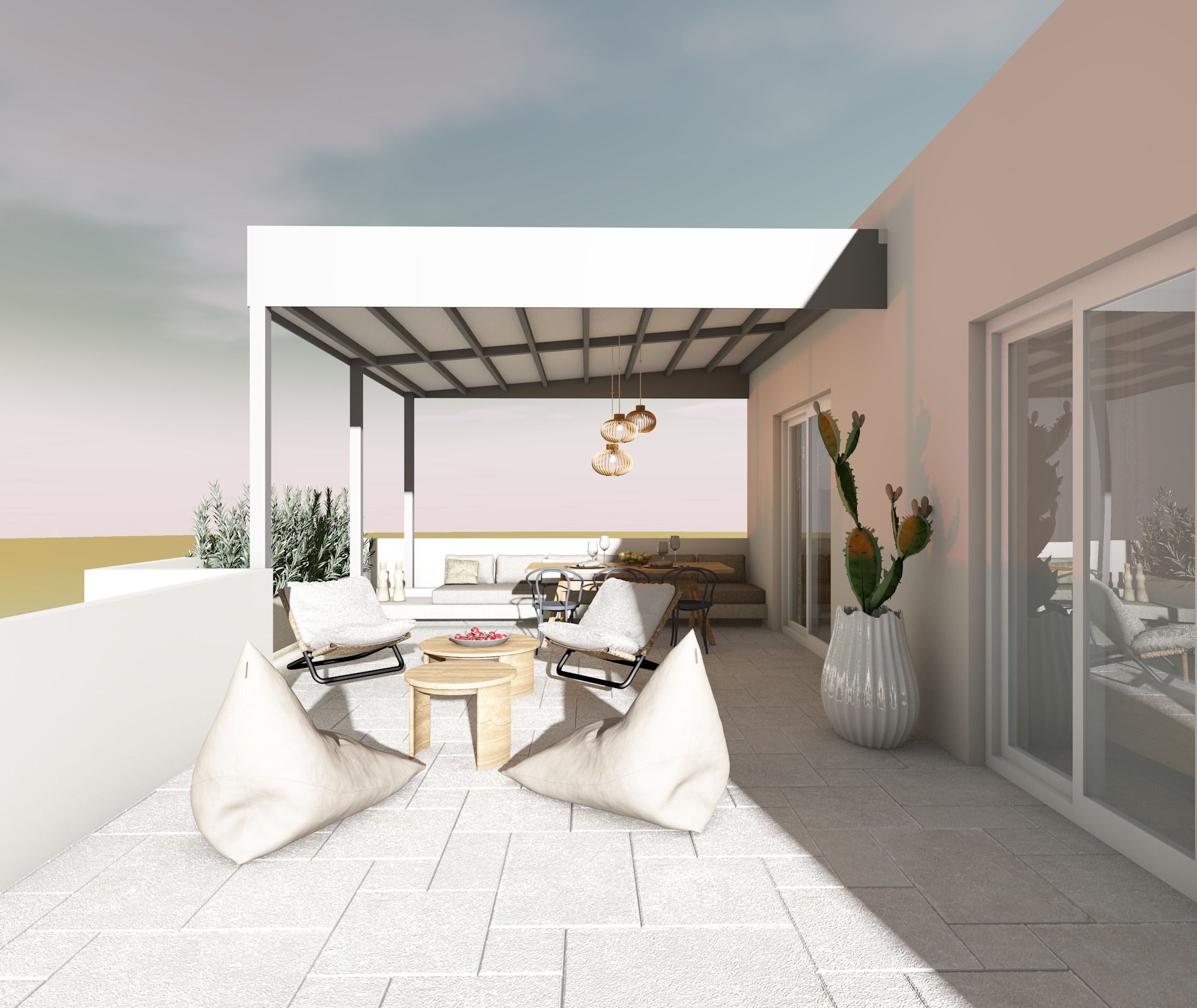 a serene outdoor under a modern pergola three pendant lights with boho casting a warm glow the table is set elegantly with wine glasses and a meal sleek black chairs surround the table adding contrast a cozy earth toned sofa inviting comfort lush green plants peek out from behind the table enhancing the natural feel the sky transitions from soft pastel pink to light blue view to other apartments and greenary creating a tranquil evening atmosphere warm neutral tones dominate the space evoking a sense of relaxed sophistication the veranda is in 3rd floor high resolution render with daylight