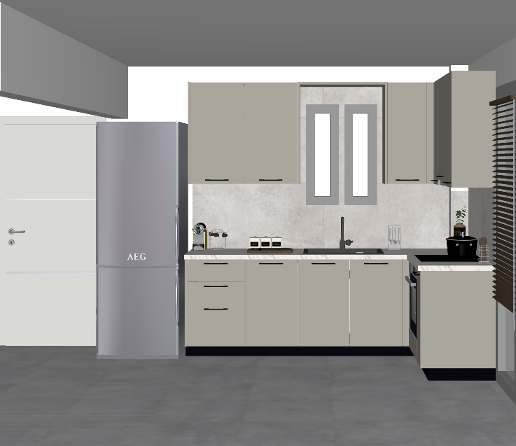 create a high resolution modern kitchen interior cabinets are a sleek taupe gray hardware is matte black fridge in brushed stainless steel countertops in a light gray speckled stone walls are a crisp clean white window features frosted glass allows soft natural light warm gray flooring in polished concrete include subtle decor small potted plant minimalist clock spice jars atmosphere is warm and inviting with soft shadows and highlights enhance lighting for a cozy contemporary feel