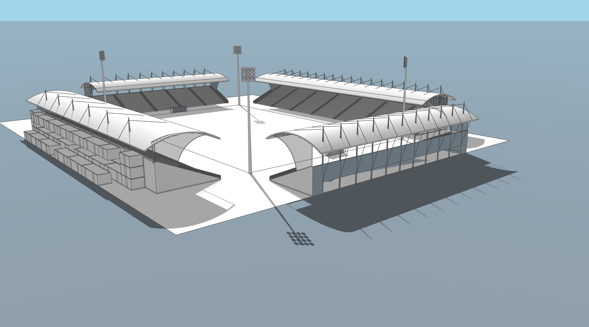 render a modern stadium under a clear blue sky use sleek reflective metallic silver for the roof structures the seats are a deep charcoal gray with subtle texture to show detail surround the stadium with a bright crisp white concrete surface add shadows to create depth and use soft diffused lighting to evoke an inviting and welcoming atmosphere