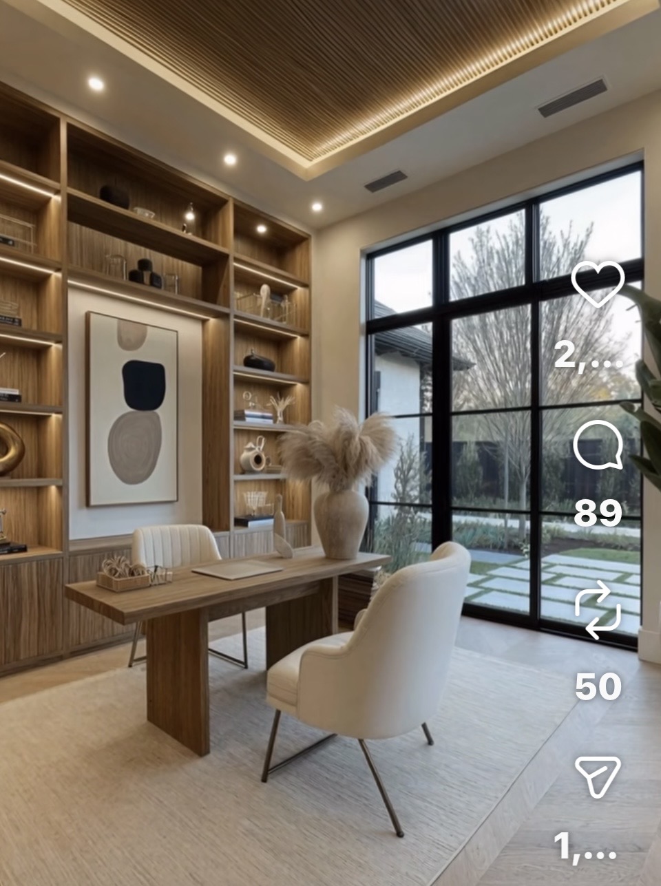 change the floors to a coloured polished concrete change the bookshelves cabinets and desk to black remove vase with gras off the desk make the view out the window a farm field
