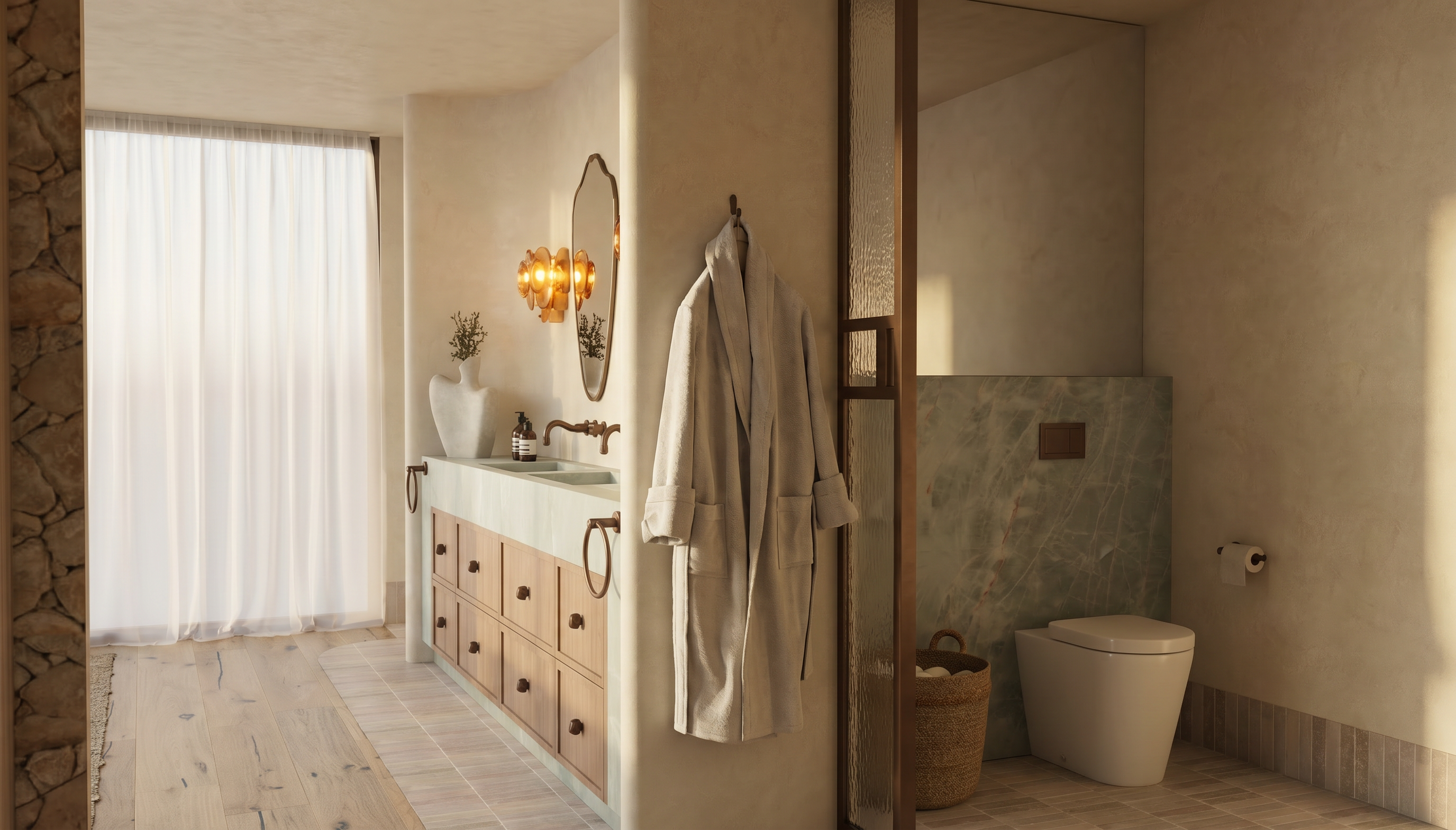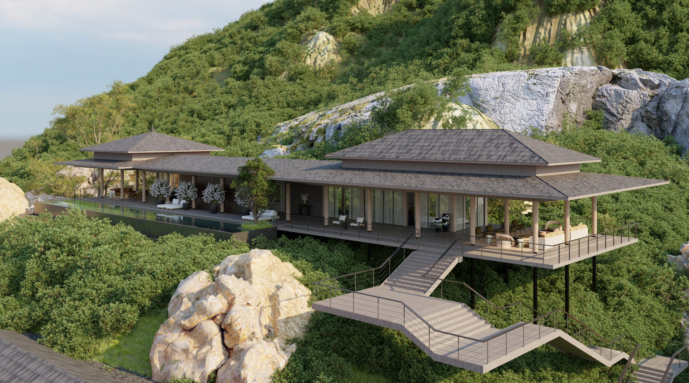 enhance the landscape environment surrounding the building while strictly maintaining the original architecture structure materials proportions and layout do not modify the building design roof geometry terrace layout columns or glazing maintain the original camera angle framing and perspective transform the terrain into a dramatic tropical hillside inspired by the grassy limestone cliffs of labuan bajo similar to rugged layered ridges covered with natural dry grass and patches of dense tropical vegetation create rolling cliff formations with sharp ridge lines and layered slopes combining grassy hill surfaces with exposed stone textures use limestone like rock formations with natural erosion patterns to create an authentic island cliff character integrate dense tropical vegetation at the lower slopes and valley areas using mixed tropical forest species such as small trees shrubs and layered foliage maintain a natural gradient from rocky upper slopes to lush vegetation below extend the terrain toward the horizon to introduce a labuan bajo coastal shoreline featuring calm turquoise sea water visible beyond the cliff edge the shoreline should appear distant but clearly readable creating a strong connection between hillside architecture and ocean landscape blend the cliff terrain naturally with the building foundation by introducing large natural stone formations beneath and around the structure reinforcing the impression that the building sits firmly on the cliff enhance lighting and atmosphere to match a tropical island setting introduce soft coastal haze toward the horizon to create atmospheric depth between the hillside and the ocean