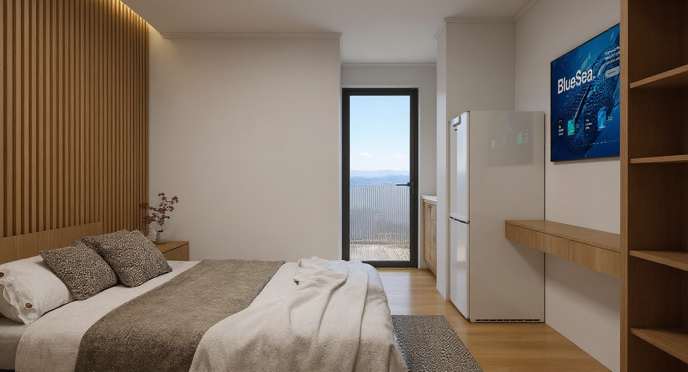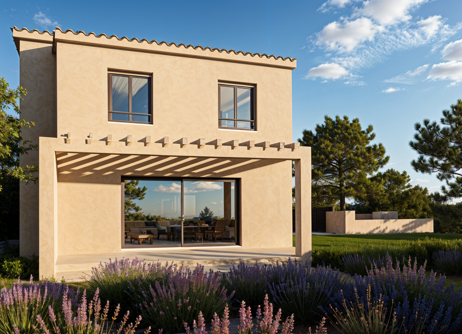 light and reflects in the windows lavender on the foreground respect the shape pines in the backgroung blue sky and clouds