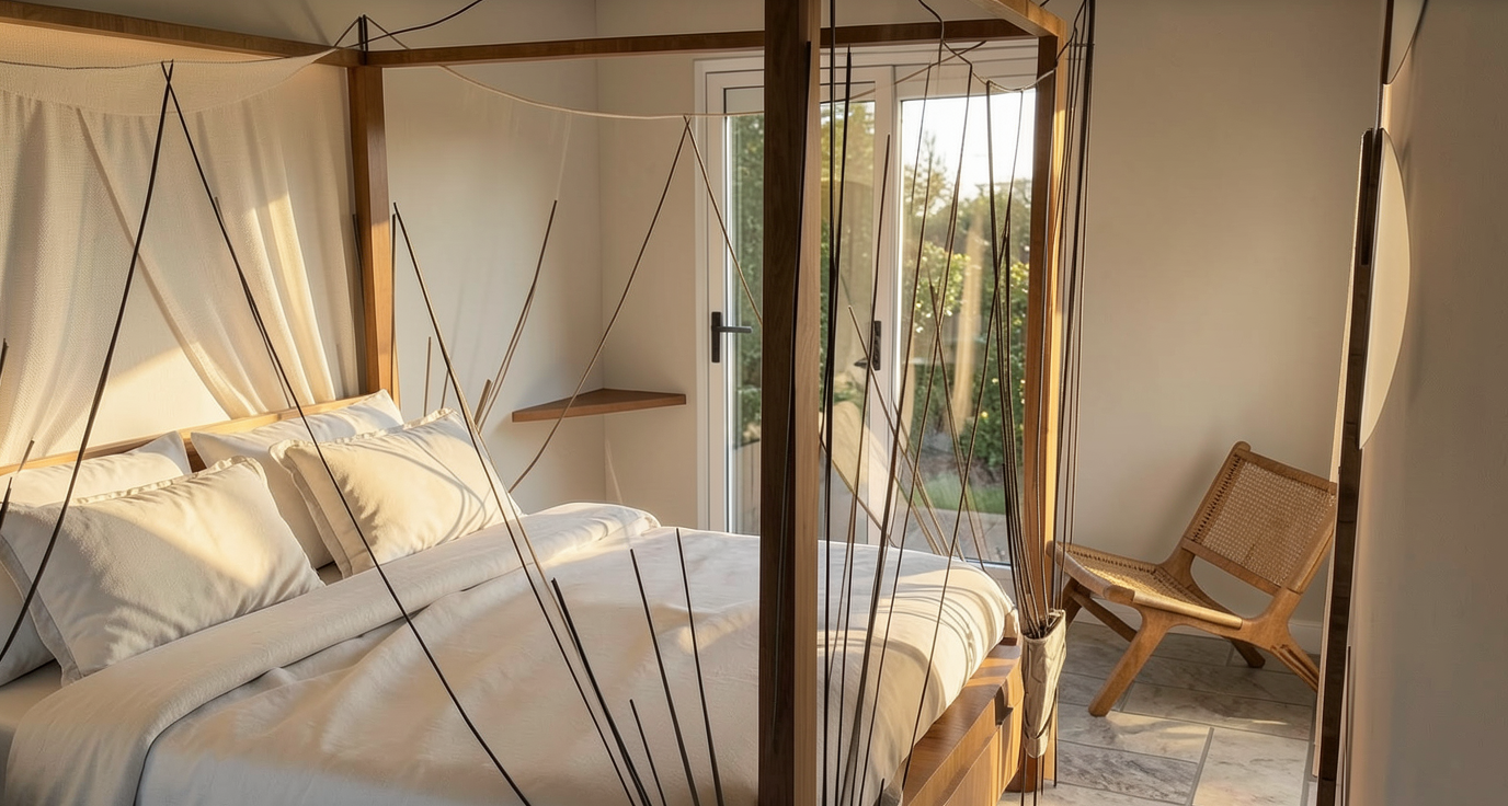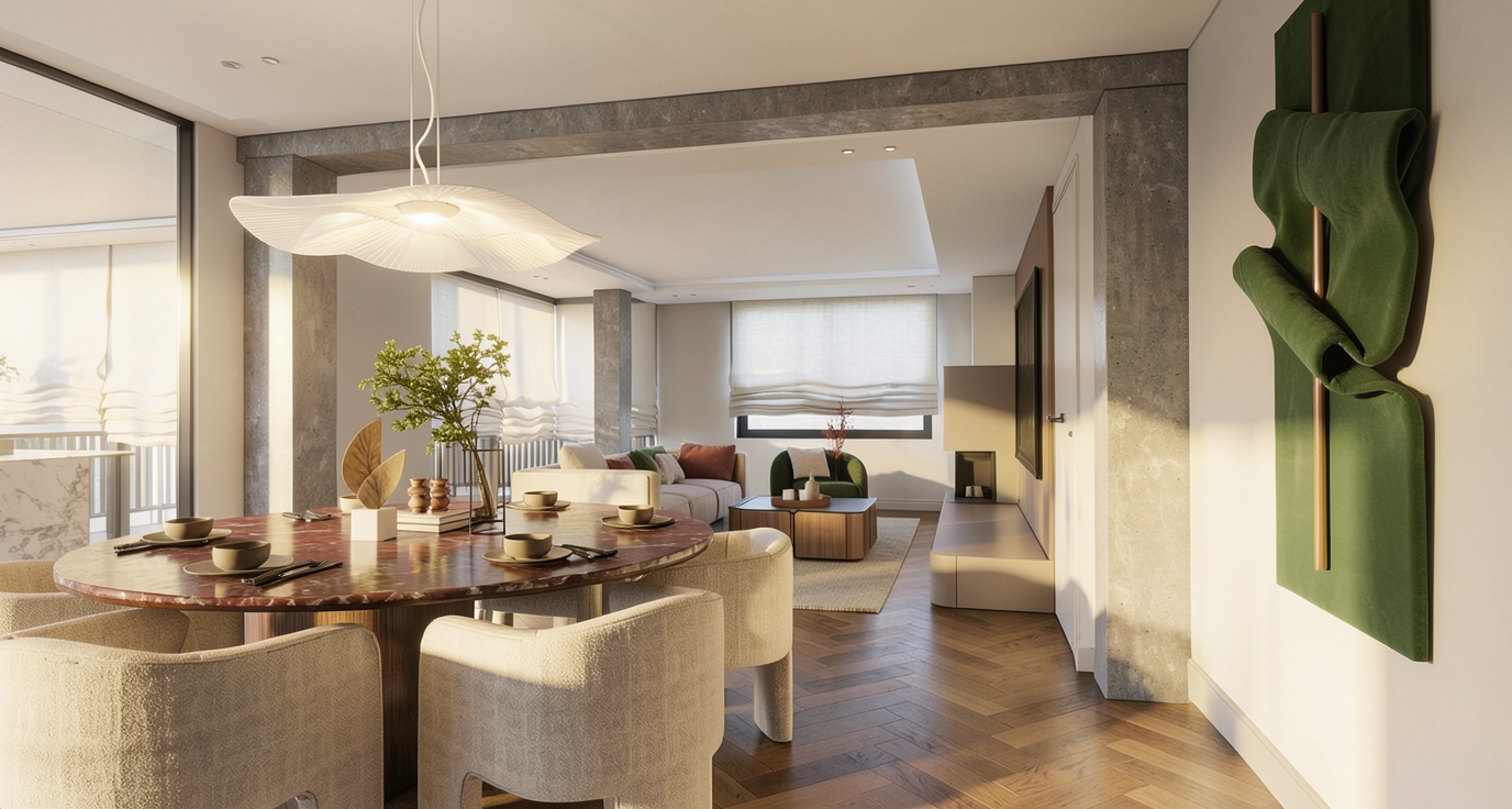 preserve the original sketchup architecture exactly as modeled do not modify geometry layout or built in elements maintain mediterranean midday natural light in barcelona warm and bright daylight entering from upper windows and openings increase natural indirect light penetration into deeper areas of the space especially inside bookshelves under mezzanine areas and interior niches simulate realistic light bounce from warm stucco walls wood floors and ceiling surfaces creating soft ambient illumination in darker areas bookshelves and interior spaces should be clearly visible and readable but without artificial glow or visible led strip lighting lighting must remain natural and architectural dominated by daylight reflection and ambient bounce light maintain warm neutral stucco walls mid century modern atmosphere and calm welcoming creative lounge environment photorealistic architectural visualization mediterranean daylight interior editorial architecture photography style