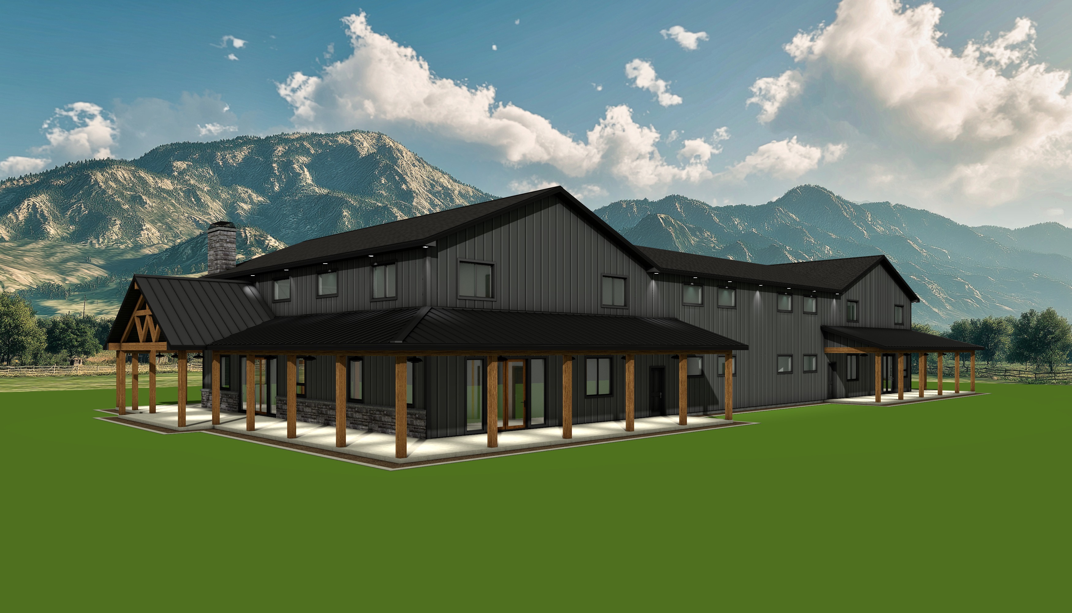 a modern house retain the exact structure colors and window arrangement rooflines siding roof material foundation height railings wood stain colors and proportions exactly as shown in the reference image integrate into the terrain there is a mountain scene with a very few trees of mixed hardwoods that are mostly in the distance of the image add cooler diffused afternoon sunlight subtle dappled highlights across the siding and grass create ultra photo realistic lighting crisp shadows detailed textures in the siding and glass reflections and an overcast sky show only a few lights visible inside render in hyper realistic architectural visualization quality 8k resolution make it the fall season add realistic landscape have an old farm fence in the background