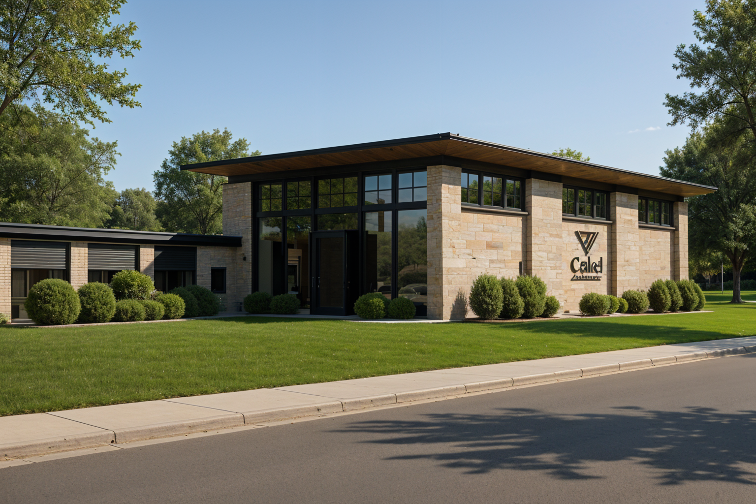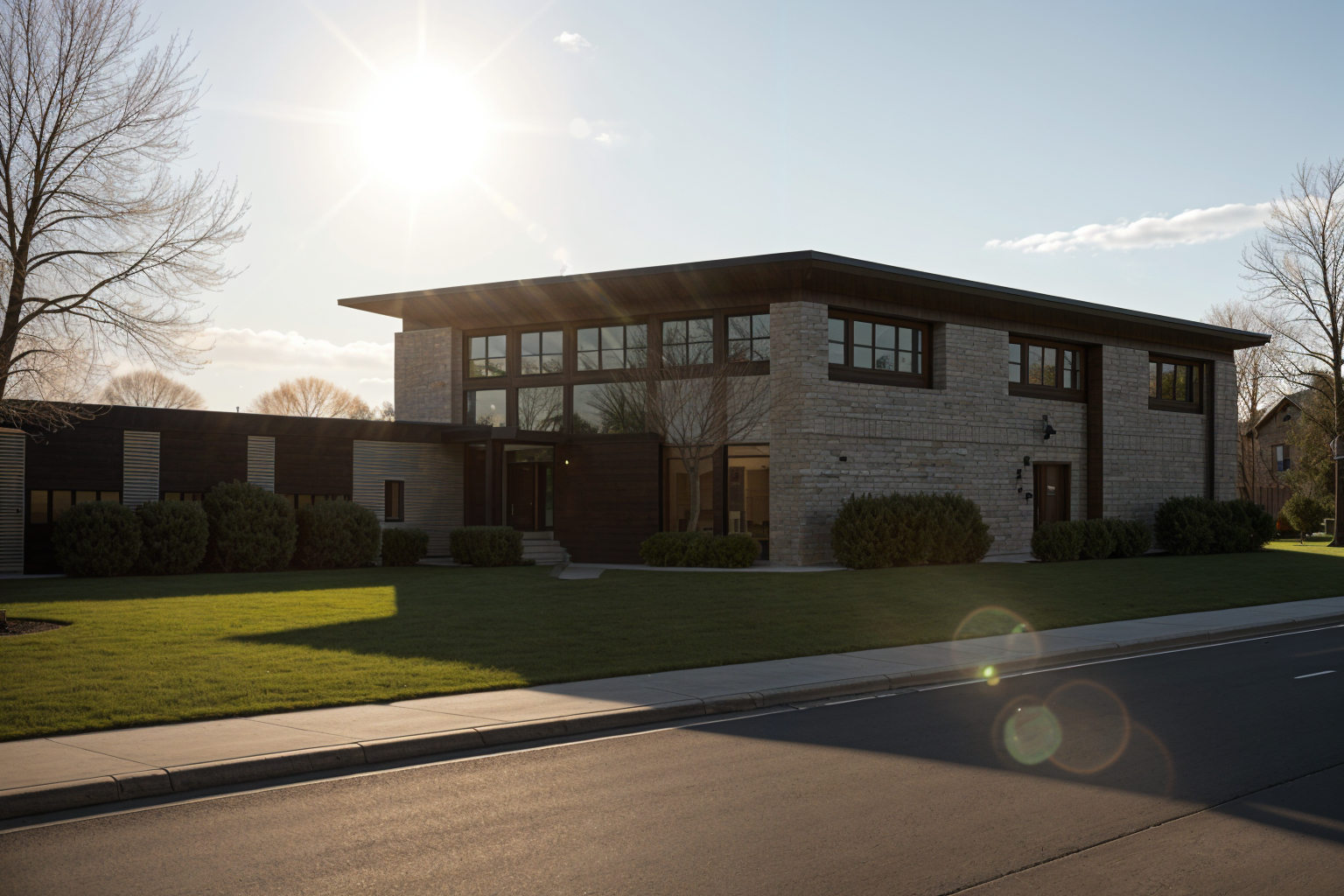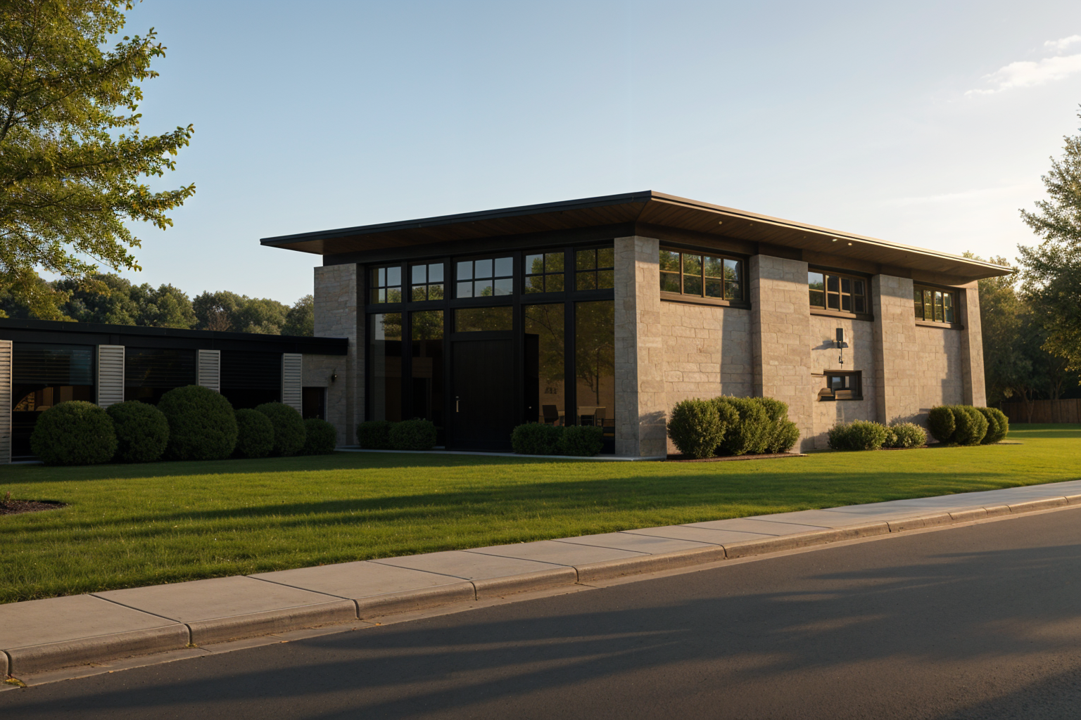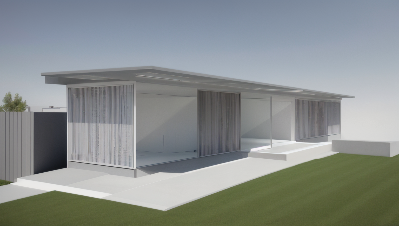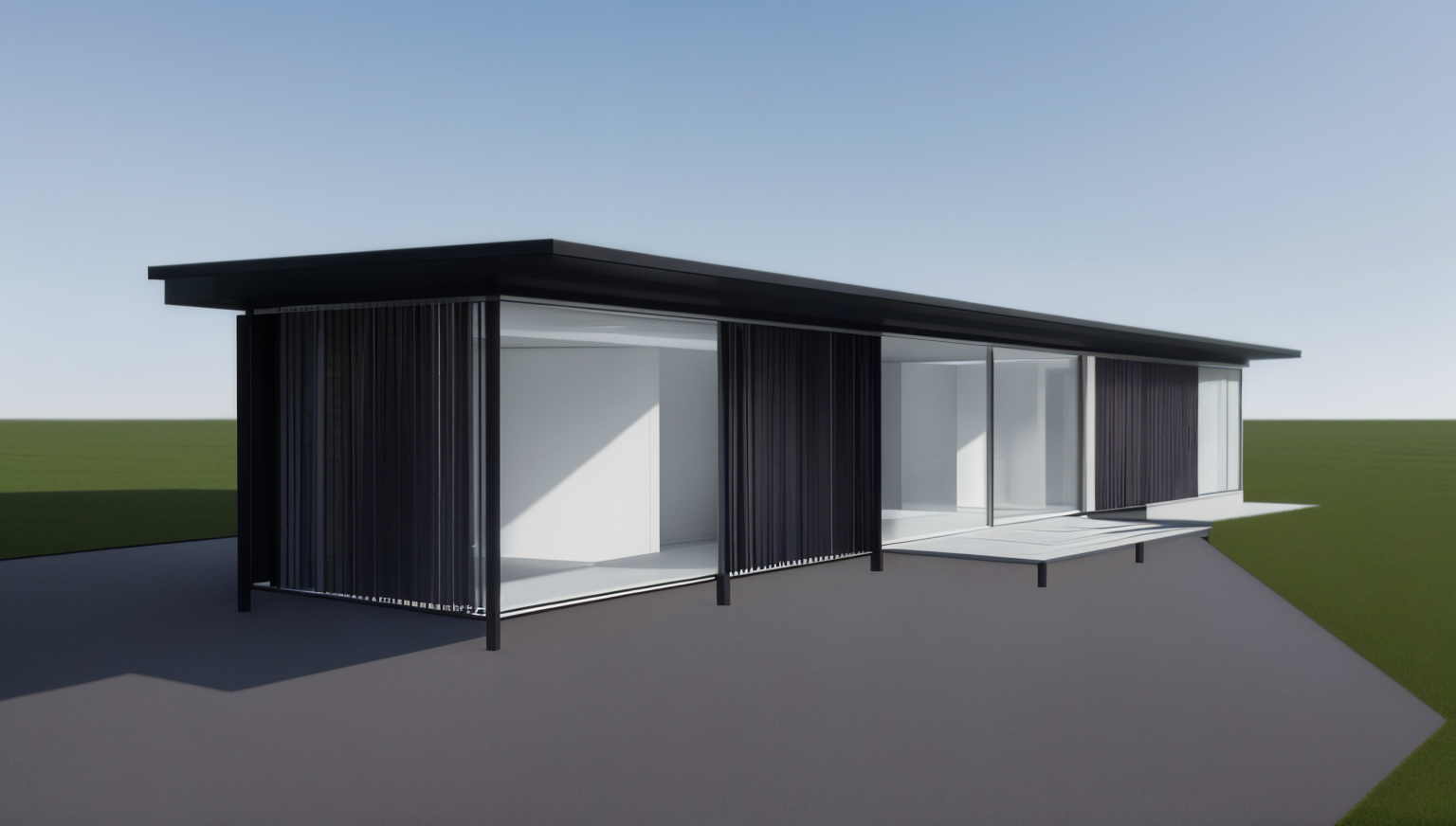 minimalism exterior shot render a modern architectural structure with a minimalist design the walls are in a muted black with sleek vertical slats the roof is flat and dark complementing the black walls set against a clear blue sky the lighting is soft and natural creating gentle shadows the surrounding atmosphere is calm and serene with a subtle gradient transitioning from sky blue at the top to a soft pastel near the horizon evoking a peaceful morning or late afternoon ambiance landscape in the forrest architecture