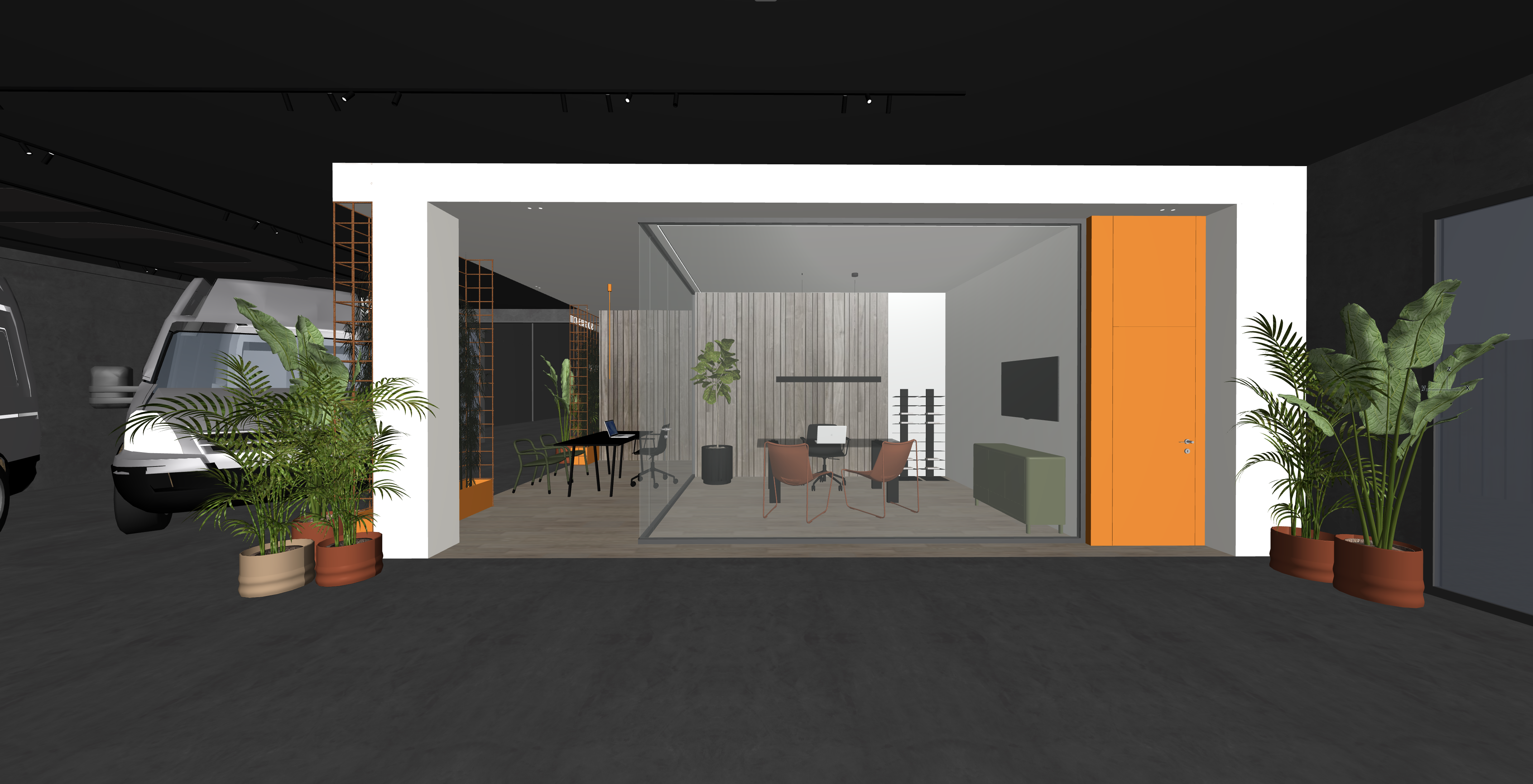 illumina la scena in modo diurno mantieni texture e oggetti invariati parquet a terra nella parte degli uffici mantieni il resto del pavimento e del soffitto invariato grigio scuro accendi luci strip led verticale alla fine della boiserie che spara verso l angolo del muro bianco accendi tv accendi strip led a soffitto all interno dell ufficio accendi faretti binario a soffitto sostituisci van della scena con van pi bello sul fondo prosegue l interno dello showroome con muri grigio scuro