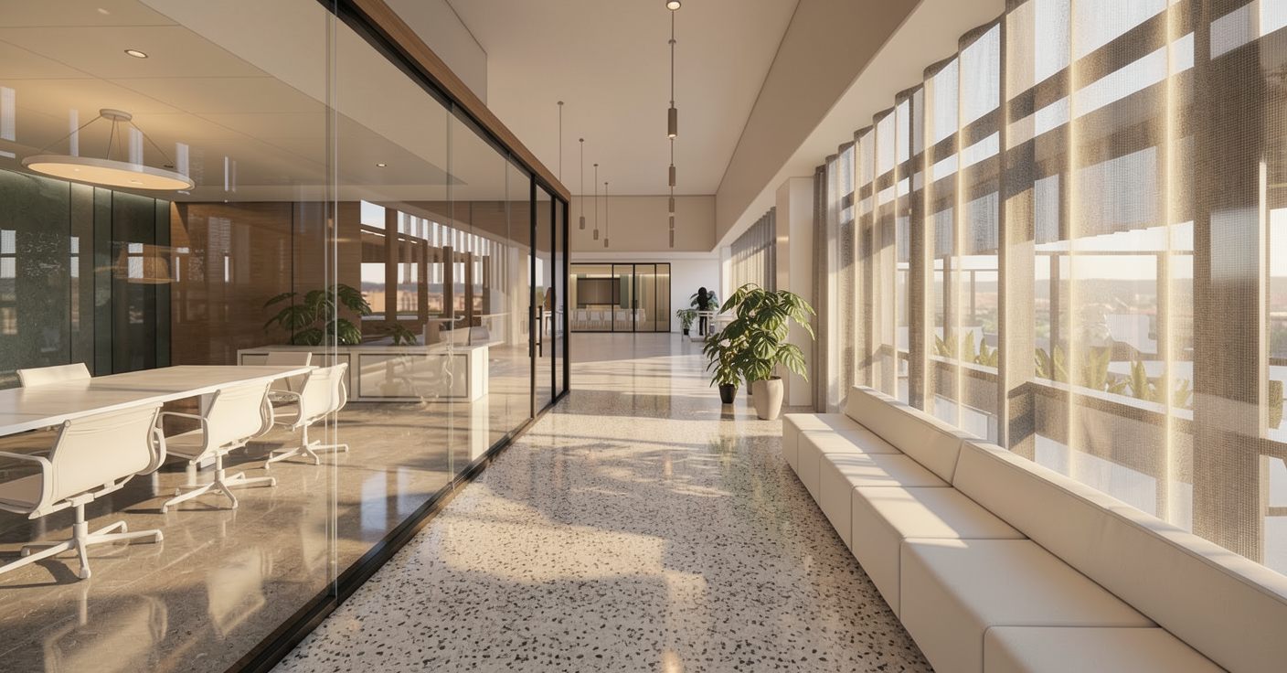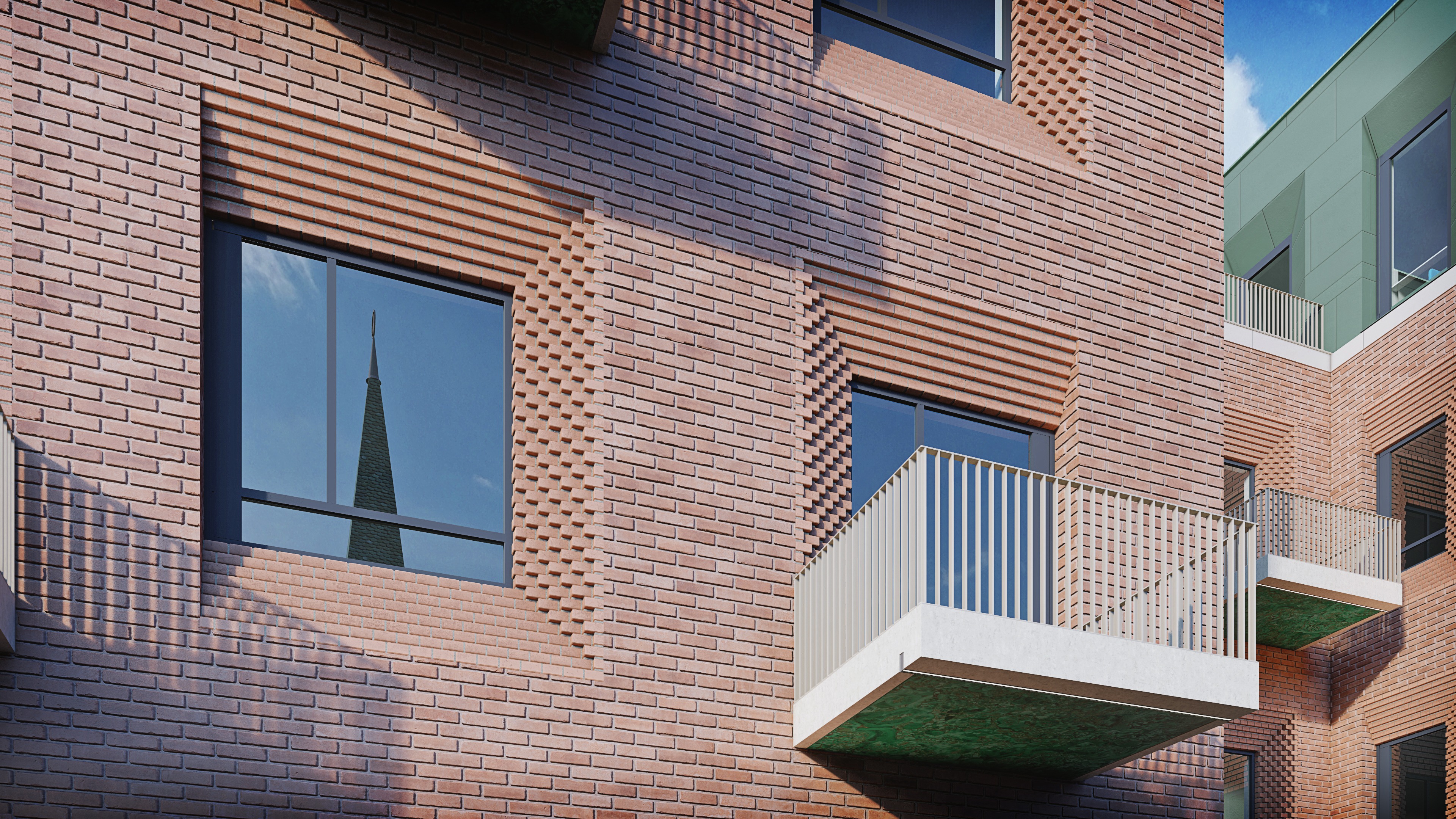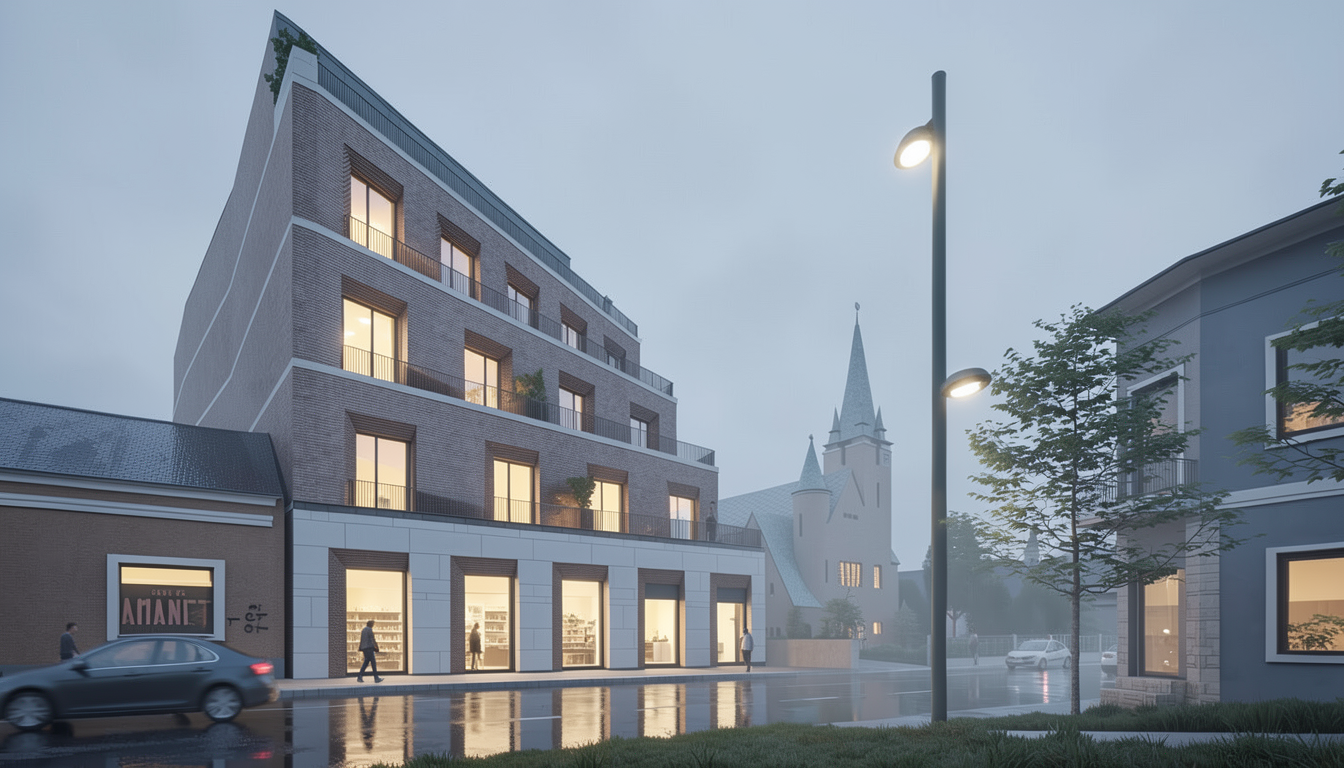 important preserve the existing geometry and the existing context exactly as provided do not modify alter reinterpret add remove scale or reshape any geometry do not change the site surroundings street layout neighboring buildings vegetation or context elements do not modify geometry scale proportions buildings road layout sidewalks or surrounding context in any way do not change text photorealistic architectural rendering clean and balanced contrast calm cinematic mood style contemporary european residential architecture minimalist premium understated do not alter the church color soft overcast evening atmosphere diffused cold natural daylight with subtle blue grey tones cinematic architectural mood warm interior lighting 3000k glowing from inside creating strong contrast between cool exterior and warm interior large glass surfaces with realistic reflections soft mirror effect subtle environmental reflections of sky and surroundings slight volumetric haze in the air for depth gentle fog diffusion in background wet pavement with smooth reflective surface soft light bounce and blurred reflections high dynamic range lighting realistic global illumination soft shadows calm and minimalist nordic mood photorealistic architectural visualization balanced exposure no harsh highlights
