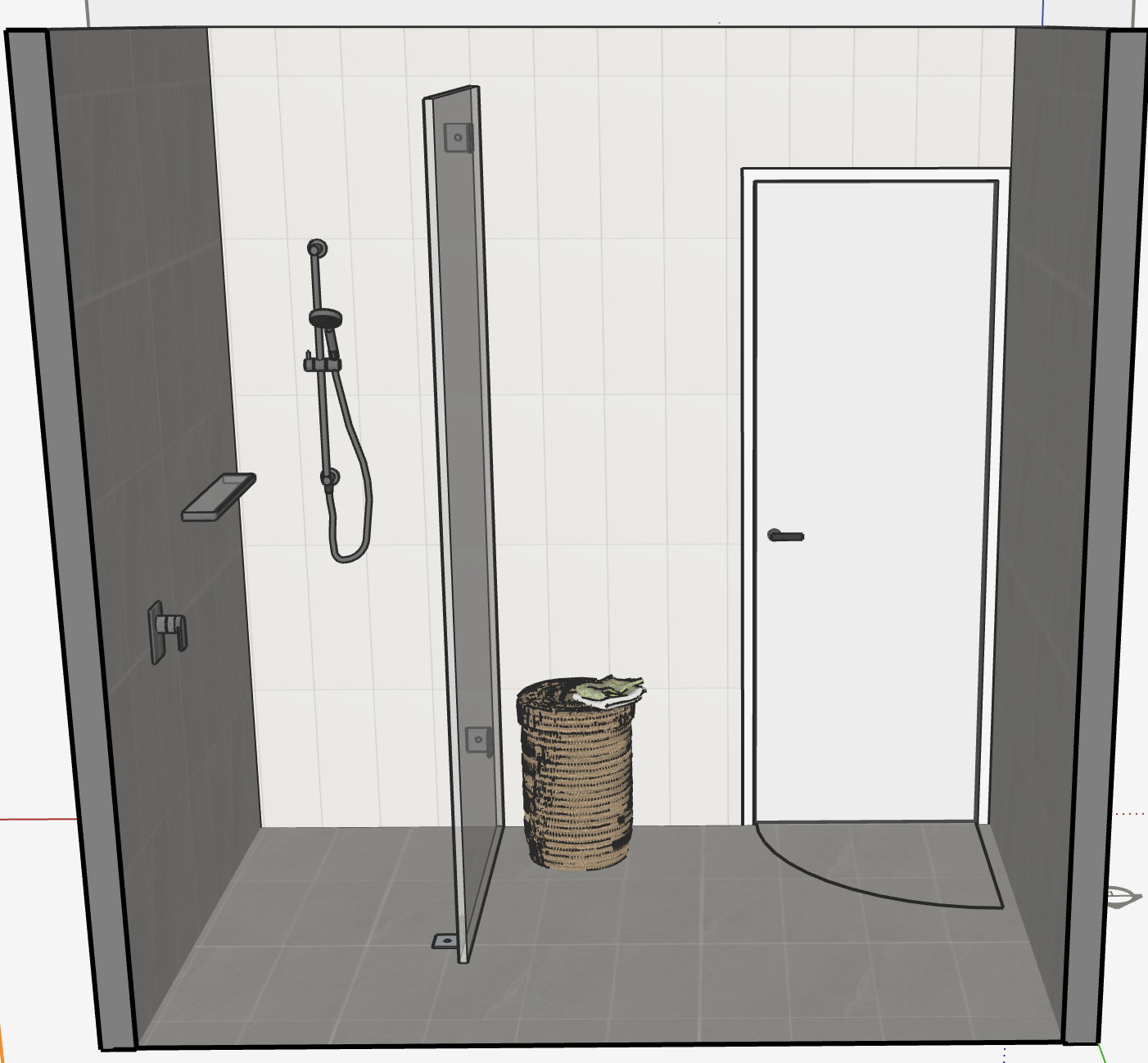 all fixtures are dark metal grey left and right walls and floor tiles are grey back wall is white tiles door is white shower screen is glass