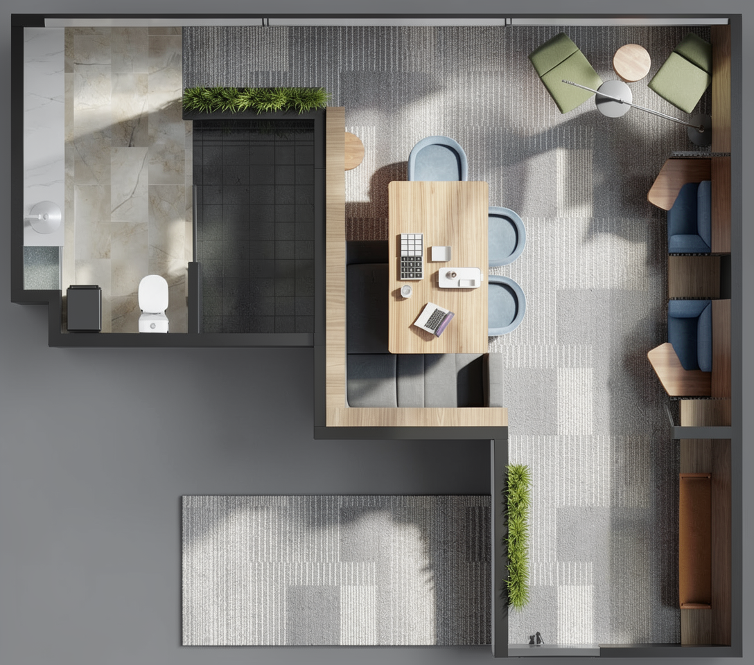 make this render look like a real life photo and put a full grey background please and remove that extra flooring texture outside the left wall on the bottom part