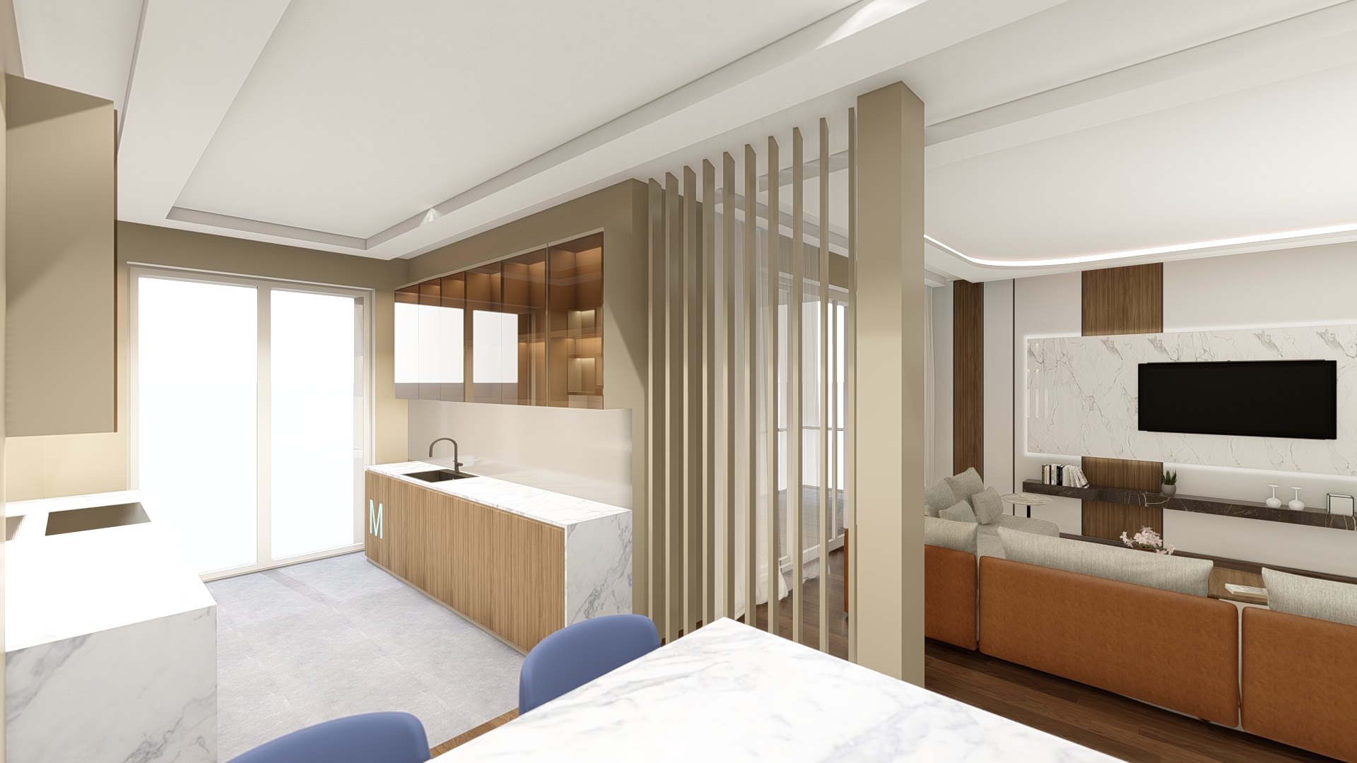 ultra realistic interior render in cinematic lighting maintain proportions camera angle and materials exactly as in the base image add soft natural daylight from the left window mixed with warm ambient led light strips and chandelier glow emphasize marble reflections wood textures fabric fibers on the sofa and soft lens depth of field keep color balance neutral and modern italian aesthetic like gallotti radice or flos interior photography style