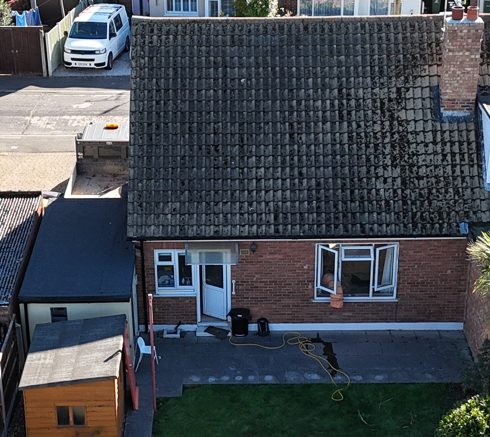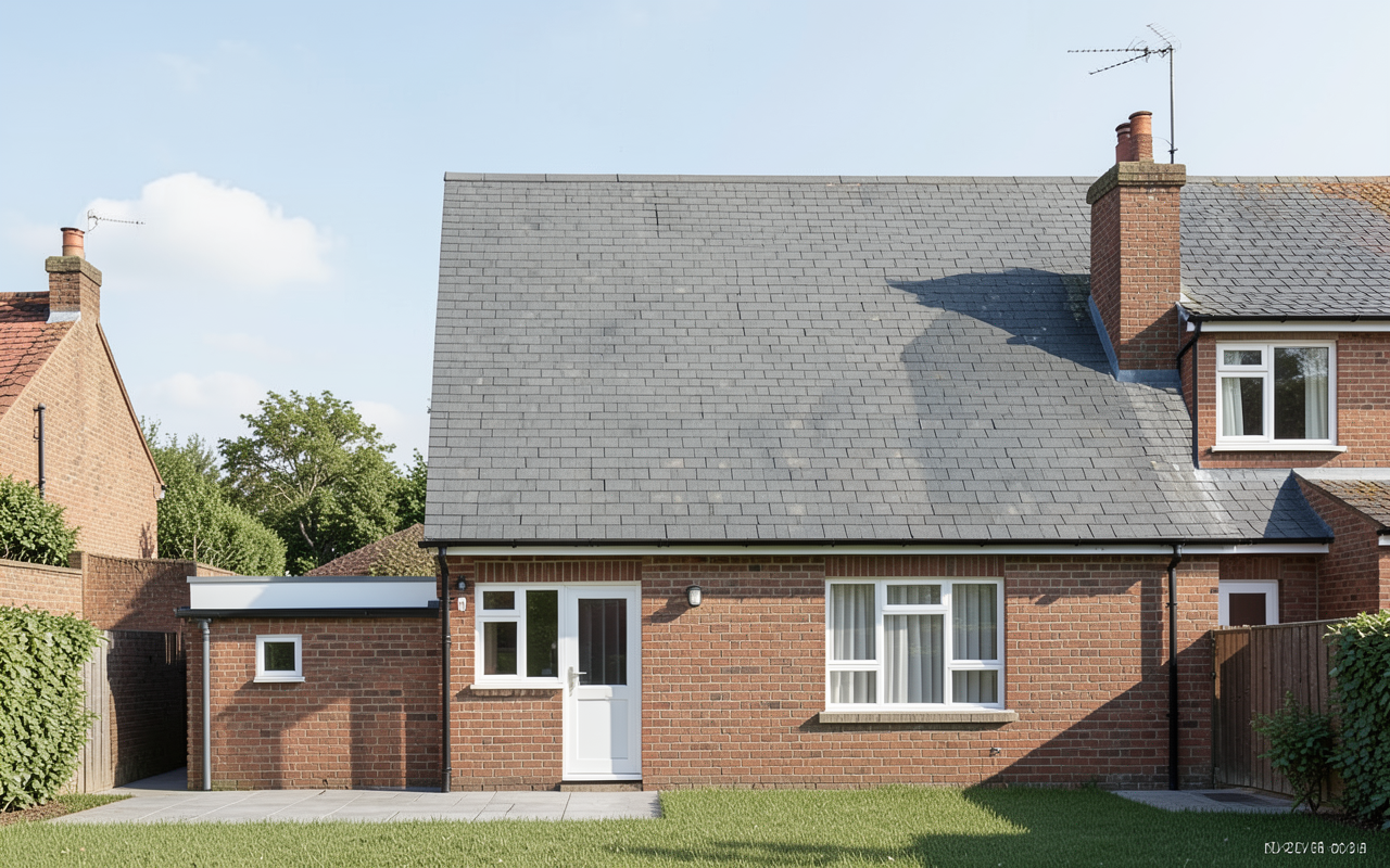 realistic architectural render of the existing rear elevation of a uk suburban bungalow keep the building exactly as shown in the reference photo maintain existing roof pitch and concrete interlocking roof tiles keep red brickwork fa ade retain white upvc windows and rear door positions retain flat roof side structure on the left keep existing patio and lawn layout match realistic british daylight conditions natural shadows professional property photography style no redesign no additional extensions no modernisation accurate proportions and perspective