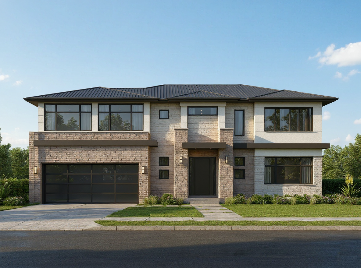 render a photorealistic 3d perspective of this house in a truckee ca reference the current material style just enhance them bronze standing seam metal roof verticle wood siding concrete walls keep model geometry the same windows doors roof walls garage door pavement driveway make a lush vegetation that looks native to truckee ca do not change the view only enhance the current materials and make the landscape nicer vegetation detailed textures in the wood siding and glass reflections and a vibrant clear sky with light atmospheric depth render in hyper realistic architectural visualization quality 8k resolution white stone add more undirect sun light