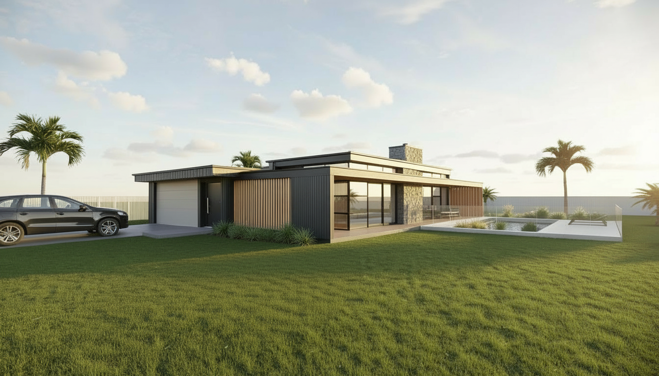 modernist exterior shot edit this image with precise architectural corrections only do not restyle or redesign critical preserve all existing materials colours and finishes exactly do not introduce new cladding types or colour variations do not create patchwork or multi tone surfaces make the following corrections garage fa ade introduce a subtle horizontal break above the garage door this must be achieved using the same cladding material and colour use a fine shadow line recessed joint or slight change in direction only do not add a new panel colour or contrasting section front entry clearly define the recessed entry beside the garage ensure the door is visible within shadow maintain the recess depth and original position fascia ensure all fascia boards are a consistent dark colour matching the roof edges deck shorten the deck slightly so it aligns with the house footprint constraints no new materials no colour changes no redesign of fa ade no landscaping changes no lighting or sky changes maintain original realism and style architecture