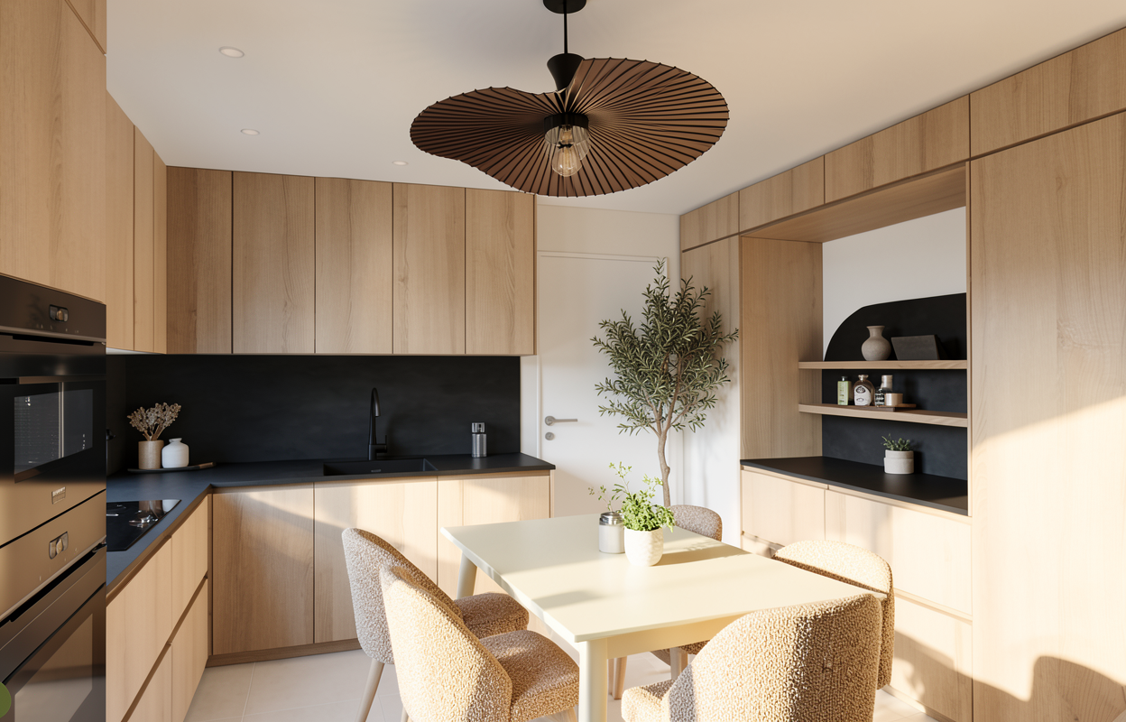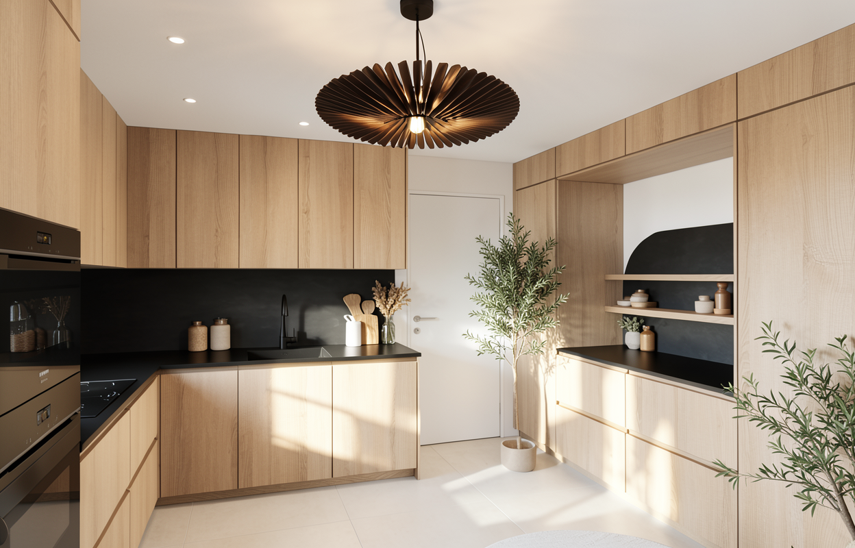 render a modern minimalist kitchen with a soft inviting atmosphere use warm light wood tones for the cabinetry and light fixtures with a distinctive intricate design the backsplash and countertop should be a sleek black providing a bold contrast and ensure the overall lighting is soft and ambient to enhance the cozy yet modern feel
