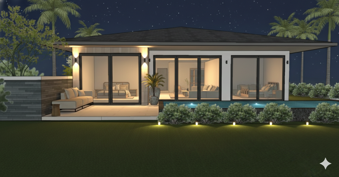 keep geometry and material color from original picture landscape tropical garden with manicured bushes and coconut trees atmosphere serene luxurious eco conscious lighting natural daylight soft shadows color palette neutral tones