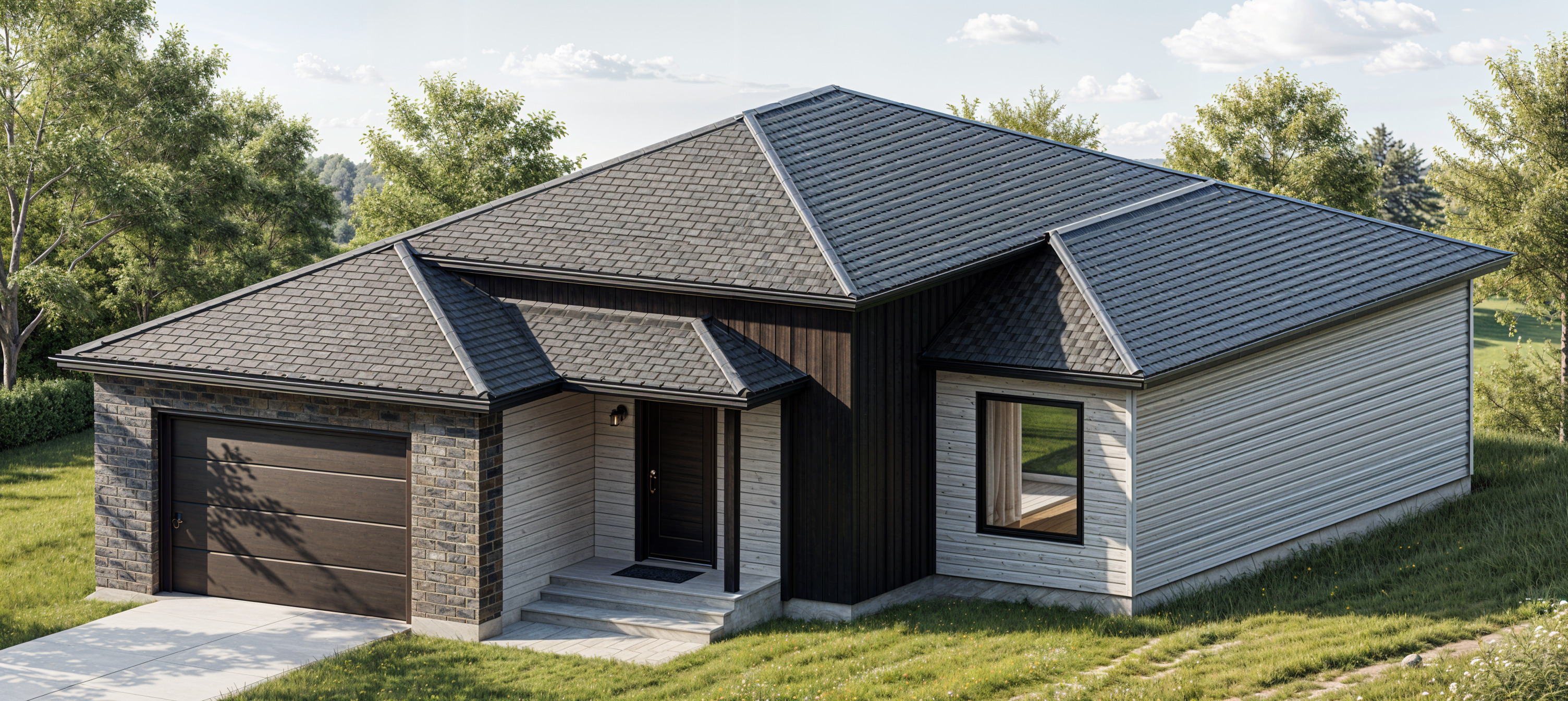 render a modern house in a serene suburban setting the house features a light gray roof with a subtle texture white walls with horizontal siding and a dark gray garage door the main entrance has dark gray double doors with glass panels a large window on the right side reflects a clear blue sky the atmosphere is peaceful and inviting with soft sunlight casting gentle shadows use a palette of light grays whites and dark grays with accents of soft blue for the sky reflection