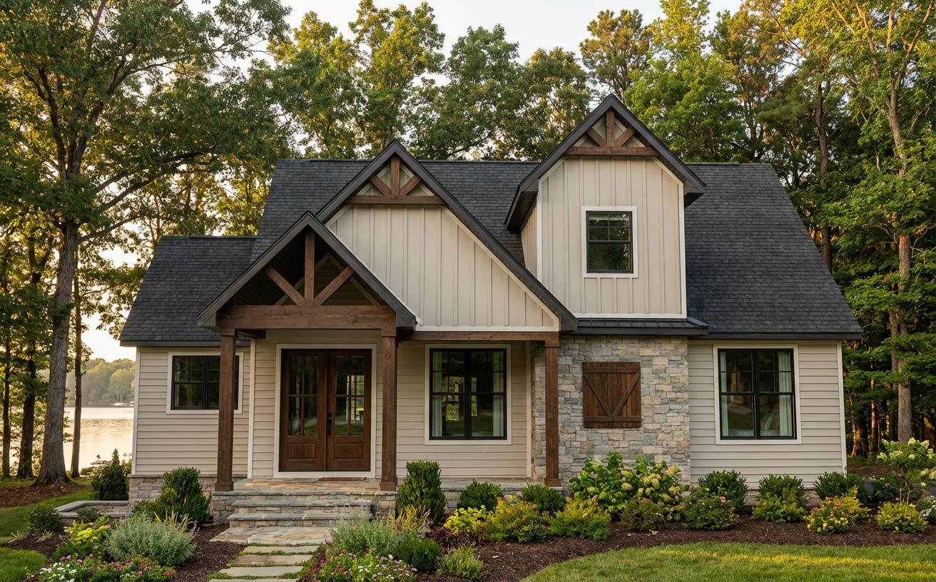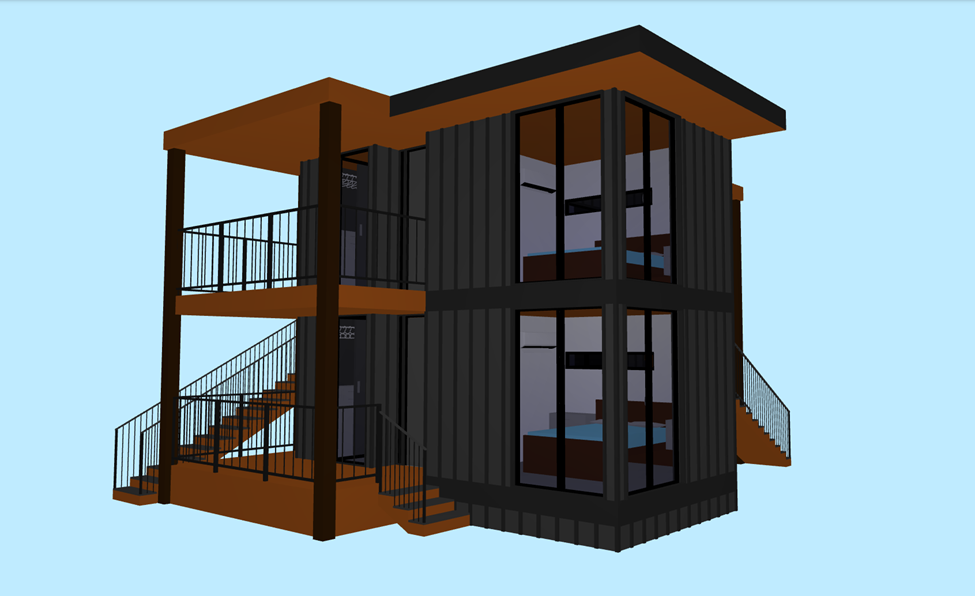 this is a two story building with guest suites on each floor the exterior is in a vertical board and batten siding there is a deck on both floors covered in a reddish brown walnut plank with the ceiling of each deck covered in the same reddish brown colored walnut plank
