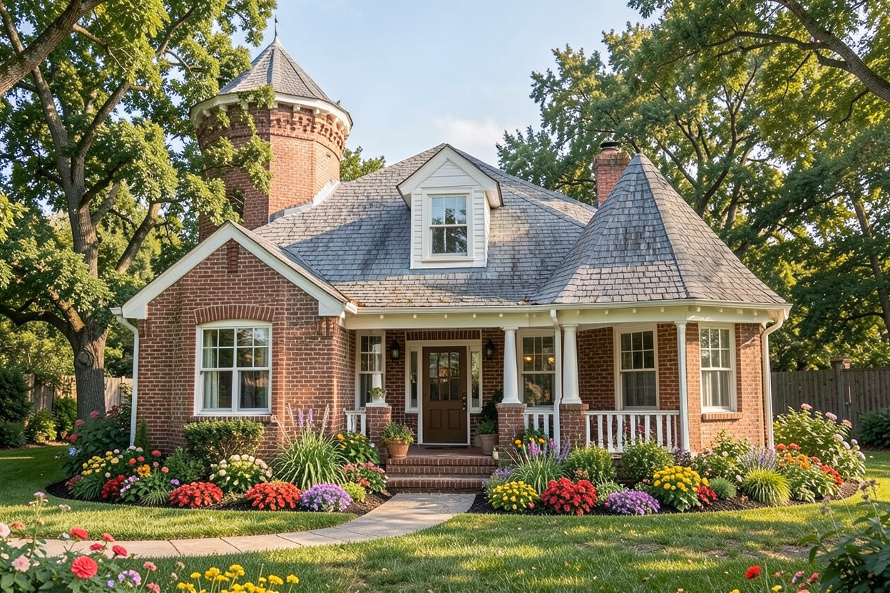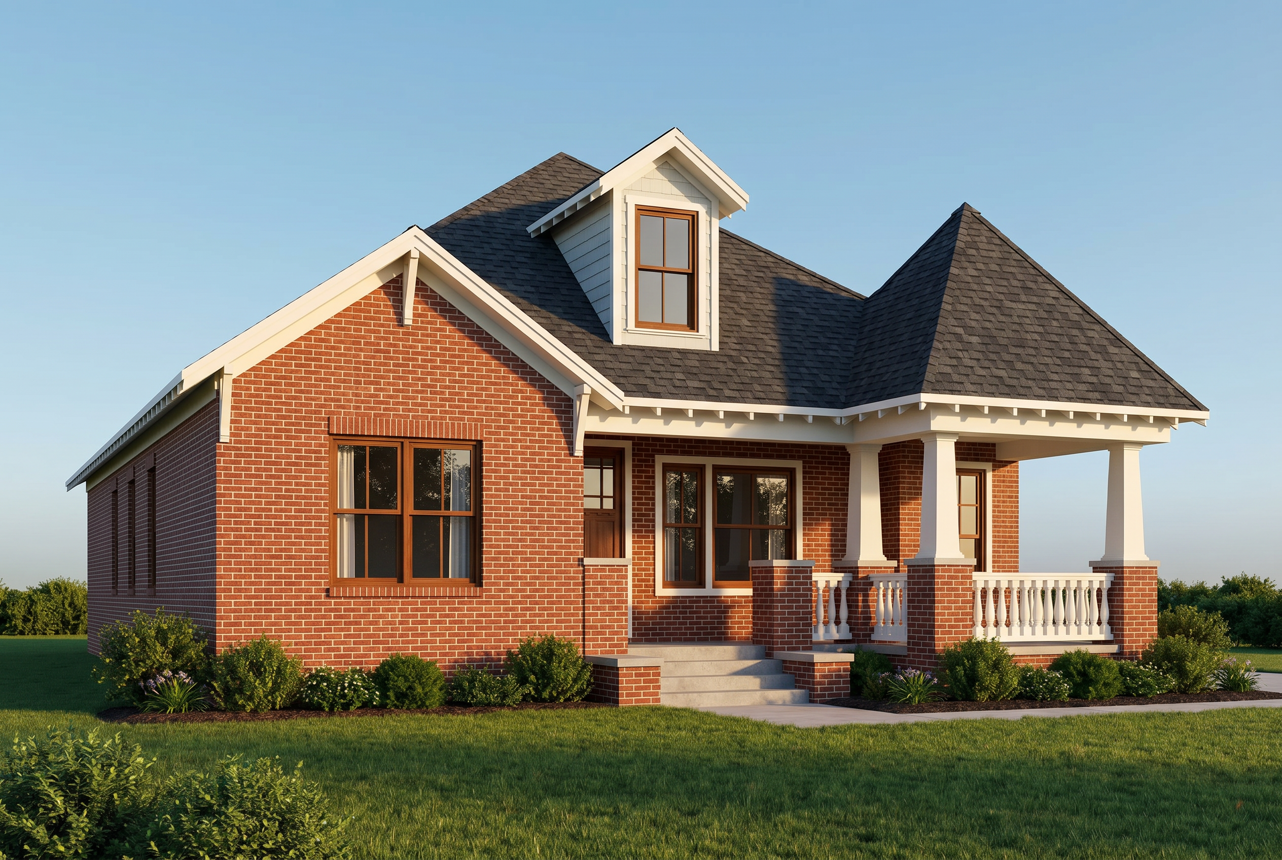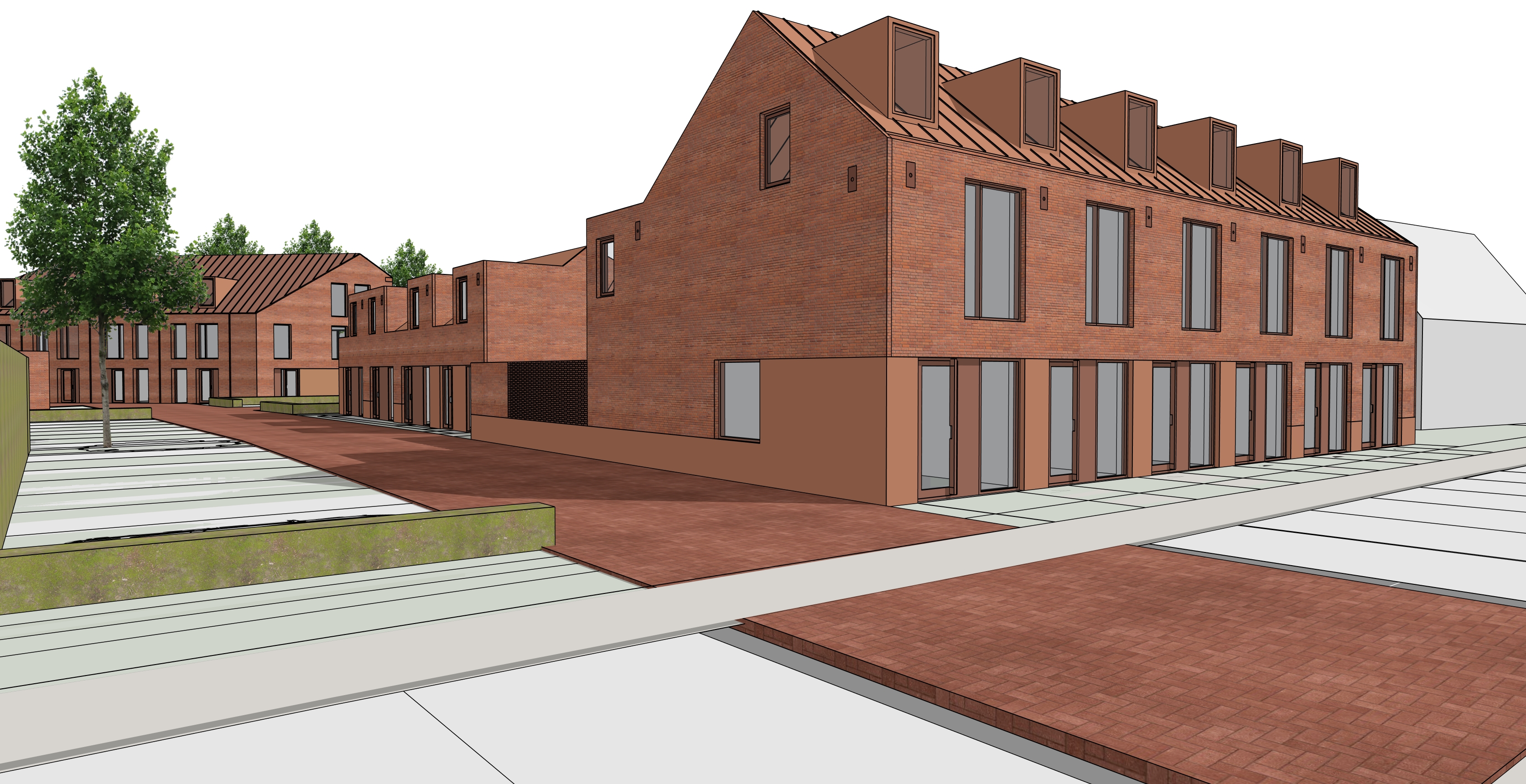 create a warm and inviting residential scene inspired by contemporary dutch architecture the main buildings should feature facades made of red brown mottled brick with window frames in an orange red brown tone behind the designed building on the left side and in front off the building add hedges allow some subtle visibility of modern interior elements through the windows with bedrooms located on the upper floors and a living room on the ground floor adjacent buildings may appear more abstract while still maintaining a sense of neighborhood cohesion and should be entirely bright white to create contrast between the sidewalk and the lower edges of the window frames include a trasraam plinth made of pigmented concrete in the same color as the window frames depict an autumn like day in the netherlands with soft slightly diffused daylight and gentle warm tones on the right side of the scene where the green ground area appears include grass with flowers additionally show a few people walking or cycling to create a calm community oriented atmosphere