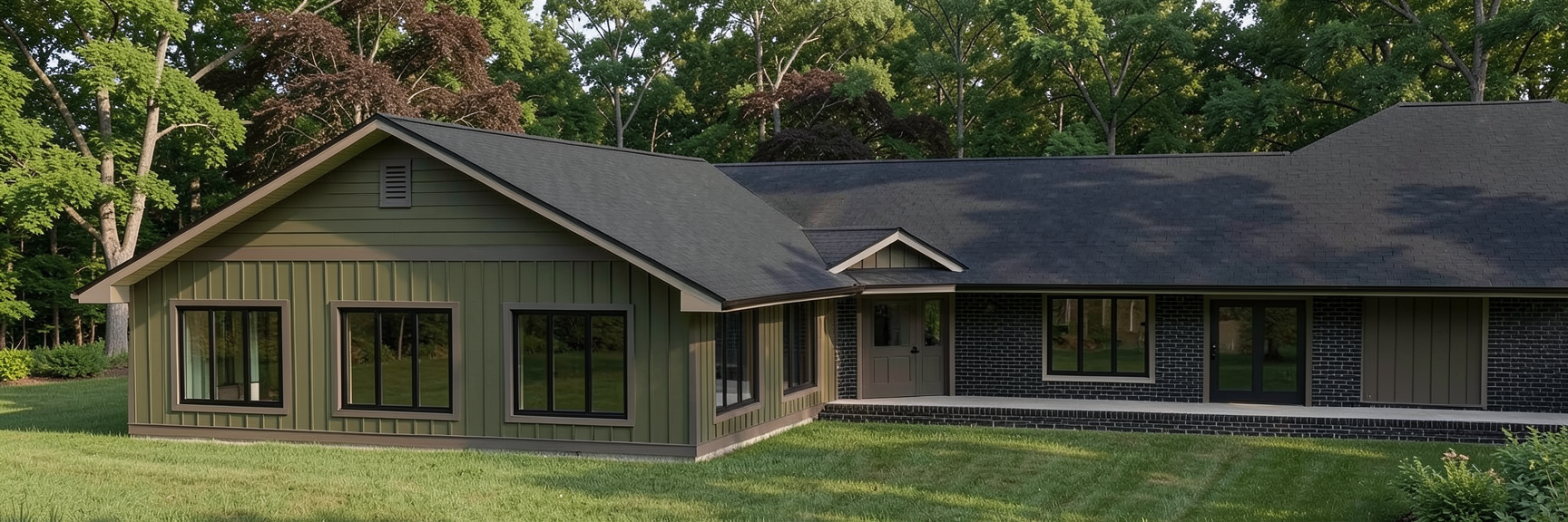 dark olive green siding black windows dark taupe trim black roof black brick brown shakes in gable add trees in backdrop