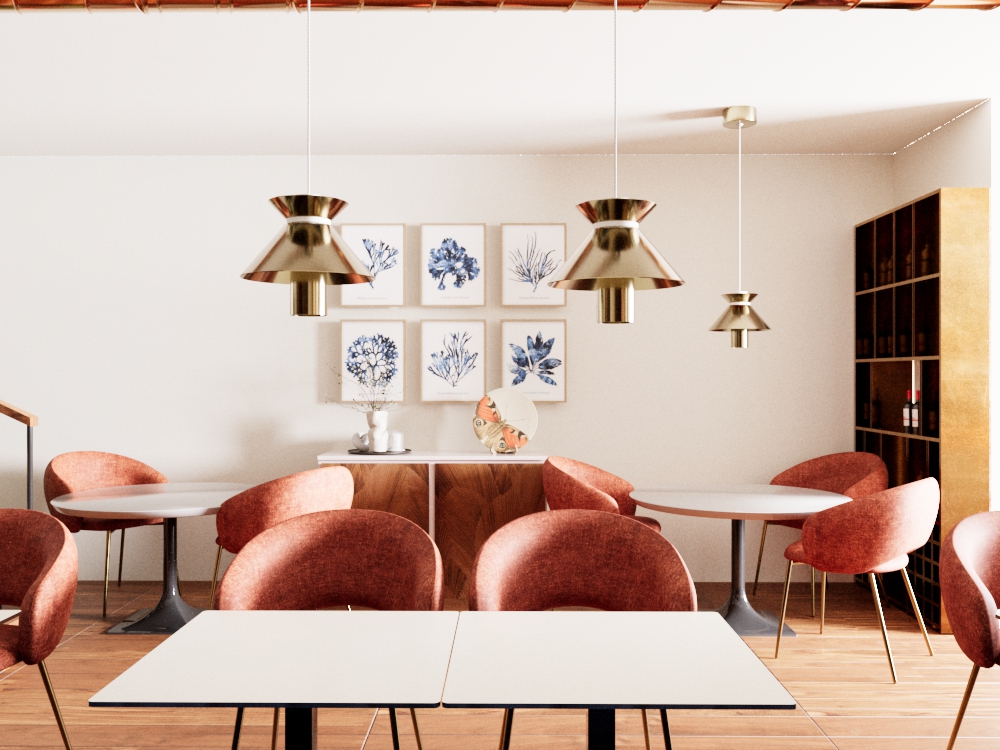 use the provided image as a fixed base maintain color mode preserve exactly the same geometry architecture camera position perspective proportions ceiling copper pipe walls floor and furniture placement do not modify architecture layout or spatial configuration enhance the scene to create an ultra photorealistic luxury restaurant atmosphere all materials must appear high end refined and extremely realistic chairs must be upholstered in deep burnt terracotta velvet hyper realistic rich tactile velvet fabric with visible grain subtle sheen soft folds and natural light absorption not plastic or glossy the pendant lamps must be the main visual focal point of the image creating a strong elegant wow effect they must emit a very warm and welcoming light around 2700k with soft diffusion refined glow and subtle reflections on surrounding materials the large artwork on the wall must appear refined and elegant with soft integrated backlighting creating a subtle halo glow that enhances the painting without overpowering the scene the wine shelf on the right must contain premium wine bottles arranged elegantly with subtle reflections and realistic glass materials tables must include a minimal chic luxury table setting refined porcelain plates crystal glasses elegant metallic cutlery linen napkins and subtle candles naturally arranged enhance overall material realism across the scene deeper wood grain on the floor refined copper reflections on the ceiling pipe and subtle natural imperfections on materials lighting must be warm cinematic and intimate creating depth soft shadows and refined contrast typical of a high end fine dining restaurant ultra photorealistic elegant contemporary fine dining mood