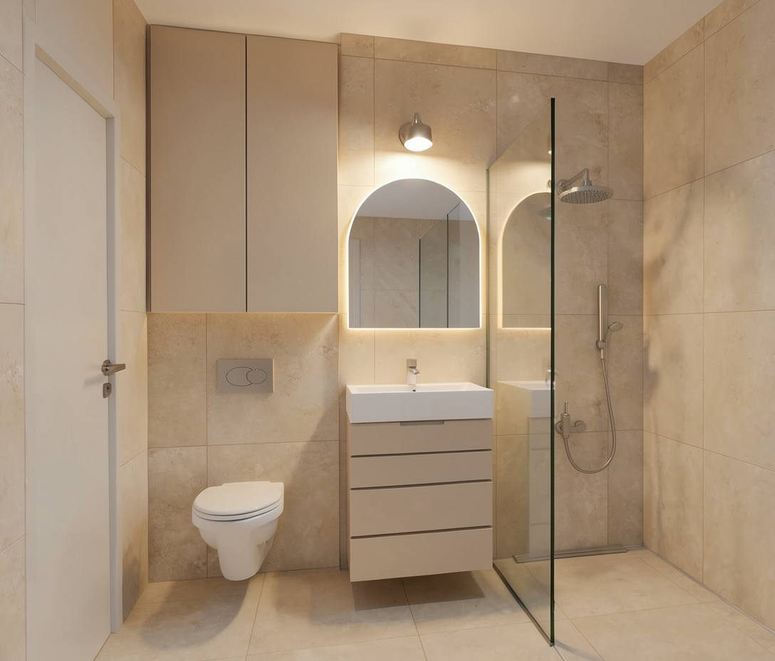 wooden shelve in the kitchen is framing the side of the oven towers too kitchen has a wall light not hanging one red and white floor with less vivid colors from the window view is to an eixample building in bracelona metal profile in bacl chair is aluminium with reflection and black material is black leather walls have and offwhite but more warm tone every light is on and warm there is santa cole lamp reference tekio horizontal on top of the wooden dining table there is no sink tab in the kitchen island