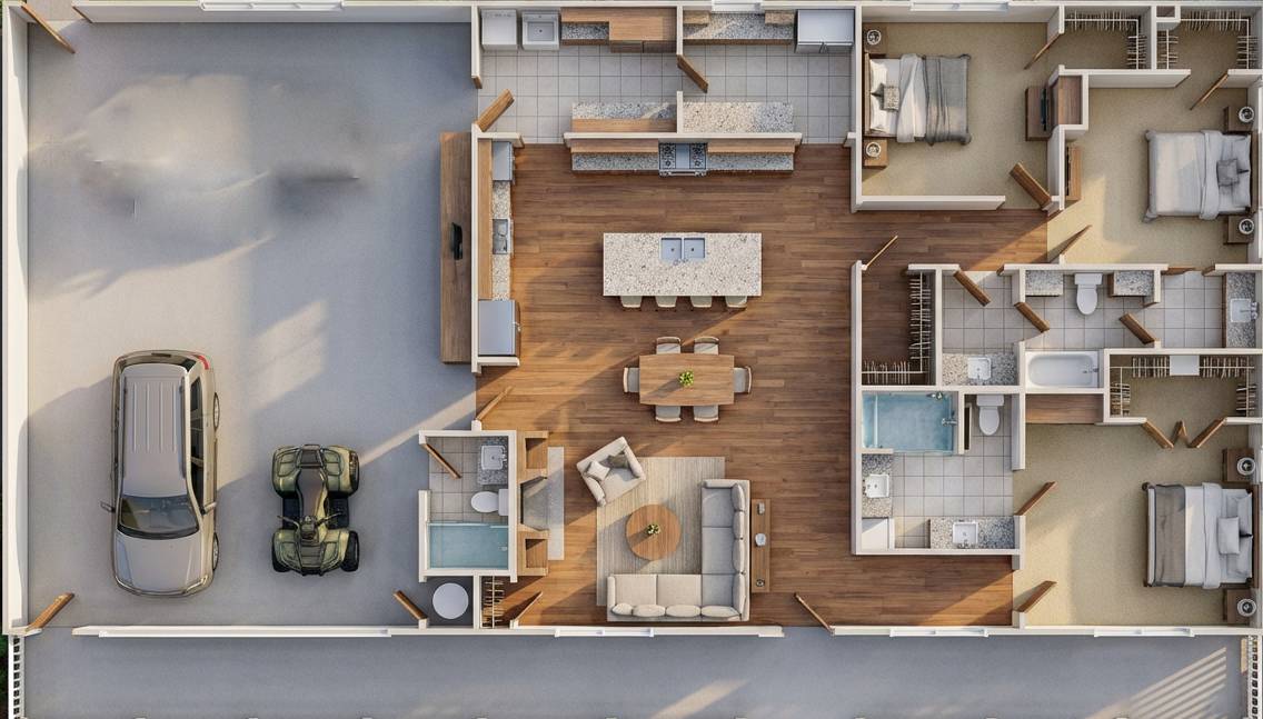 you are a professional image renderer you create the highest grade renderings around and specialize in architectural renderings this is the floor plan of a house create a marketing floor plan that showcases this home design keep the windows as they are where they are keep the doors as they are where they are keep the main structure as it is where it is feel free to change the perspective do not add anything to the structure i have not asked for