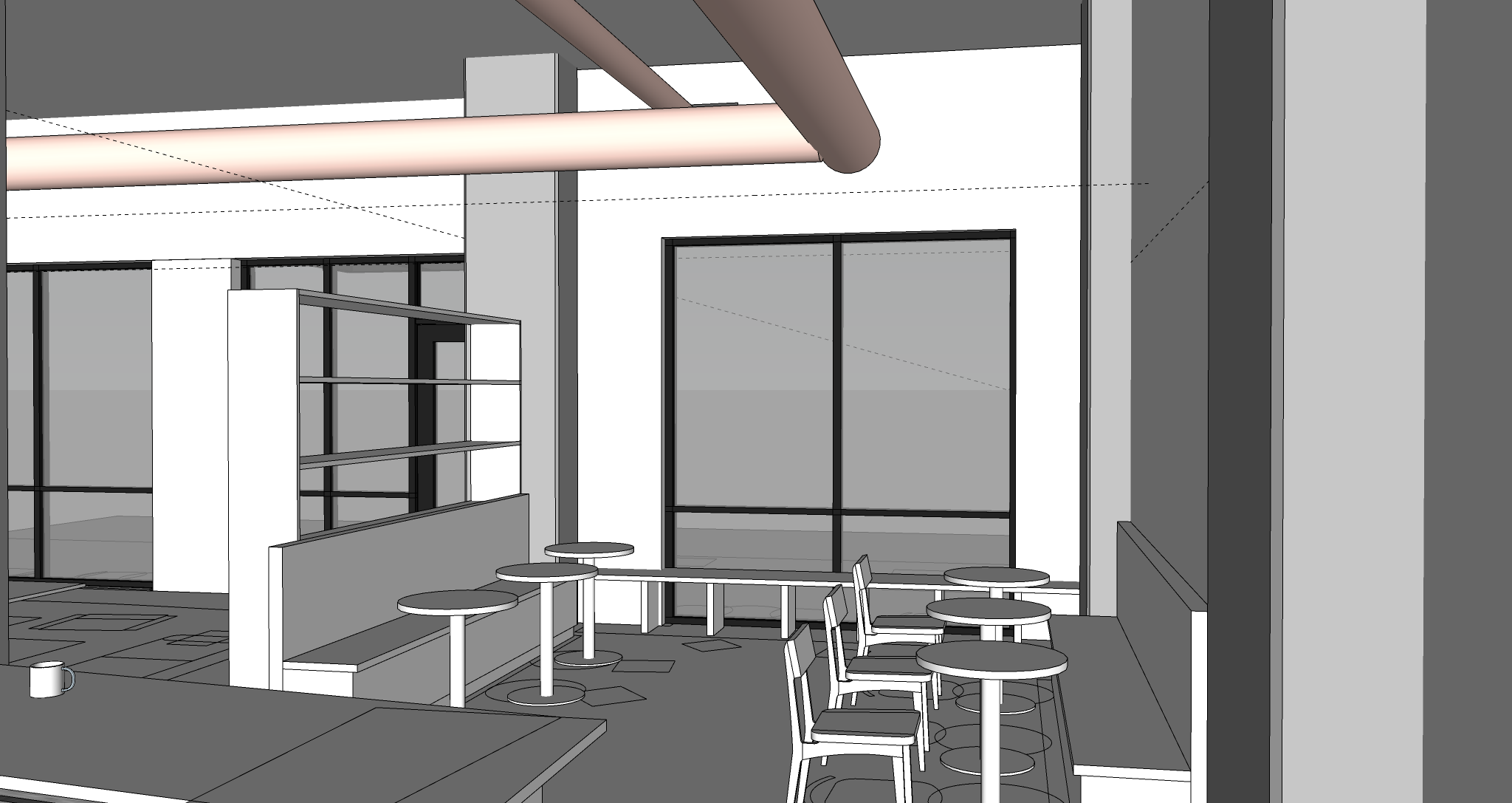 warm and inviting and welcoming coffee shop some teal color accents on wall wood finishes and textures polished grey concrete floor white and cream on wall textured walls green leaf plants in the scene fun lighting leather seat cushions add sunshine to the view architecture