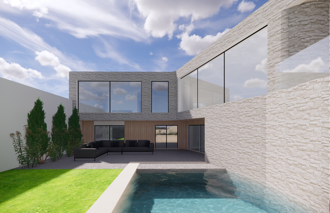 create a very elegant high end contemporary fa ade with a warm and luxurious appearance incorporate the following stylistic elements from the reference images vertical wooden cladding in warm natural tones light stone or refined mineral surfaces with a soft premium texture integrated linear lighting e g in ceilings or fa ade recesses minimalist combination of wood stone dark slim window frames for contrast clear sculpted greenery modern architectural planting soft exterior lighting for a premium atmosphere a calm timeless sophisticated overall look specific requirements keep the building s architecture shape window sizes locations and all proportions unchanged replace existing fa ade materials with a refined combination of vertical natural wood cladding warm elegant smooth or lightly textured modern stone surfaces update the outdoor area with clean elegant tiles in light tones modern planting inspired by luxury residential landscaping discreet integrated lighting maintain realistic materials lighting and shadows produce results that look like high quality architectural photography goal transform the existing house into a luxury modern elegant residence using only fa ade and material changes while leaving the architecture completely intact architecture