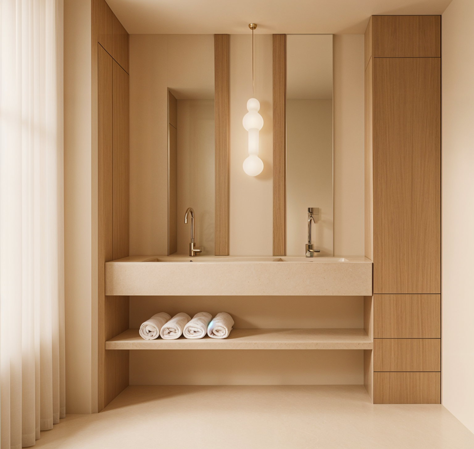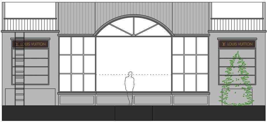 perspective shot this is an elevation of what i want to model in 3d it s a wall 14 meters long and 5 5 meters high in front of it there s a platform 5 meters deep and 80 cm high i want a christmassy atmosphere like santa s workshop in the center there s a large bay window on the sides there s a mezzanine with a railing 4 meters high in front there are workshop tables the style is rustic wood