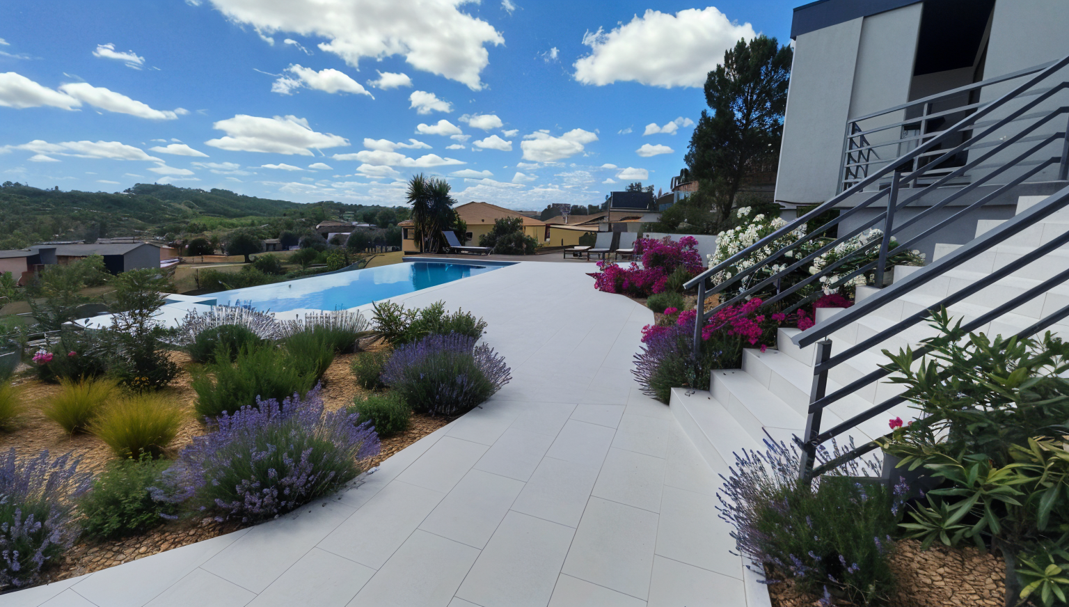 generate a night view with recessed spotlights along the edges of the pavement around the planted areas place two recessed spotlights on the ground next to the entrance to the staircase at each end of the stairs
