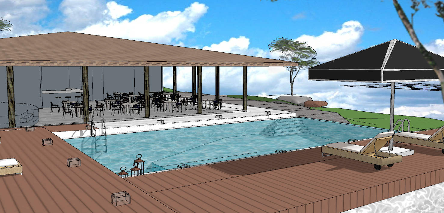 make a render of this clubhouse with infinity pool on a sloping terrain and facing the beach front on the right