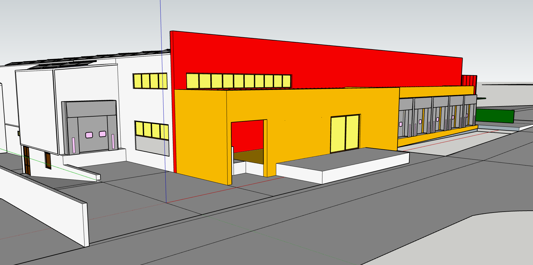 ultra realistic rendering of a modern industrial building light grey metal composite panel fa ade with subtle panel joints and red crisp edges large reflective blue tinted glass curtain wall at the main entrance showing realistic reflections of the sky and landscape sharp geometric volumes forming a cantilevered upper block highly accurate perspective proportions and geometry as in the reference image exterior with smooth asphalt pavement bright daytime sky with soft cloud textures realistic shadows and natural lighting photorealistic textures high detail clean and sharp finish