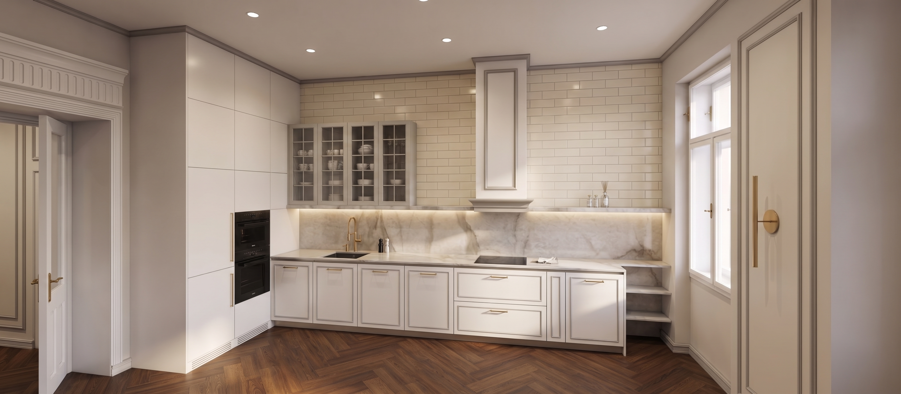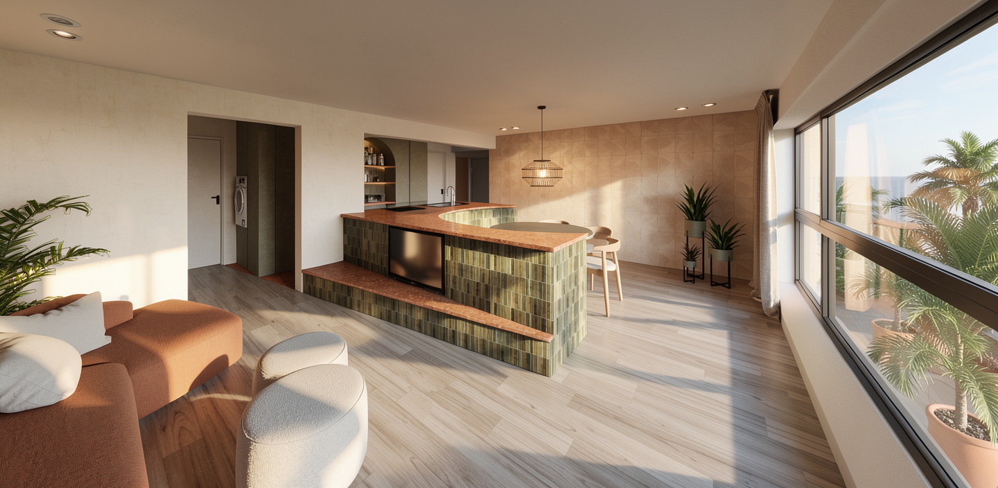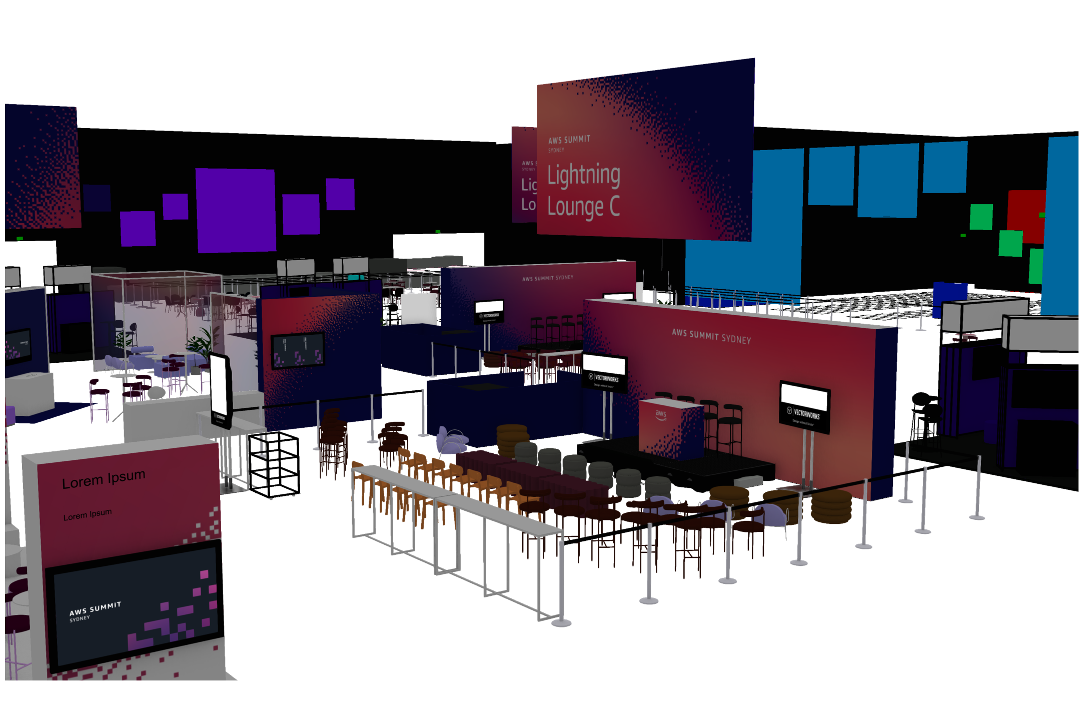 realistic dark expo environment workshop space slightly vibrant atmosphere polished concrete floor subtle light focusing on main space have business people with pink glowing headphones sitting at the seats in front of the stage wall presenter on stage speaking slight blur of background have people walking past blurred light square gobo lights on floor scattered