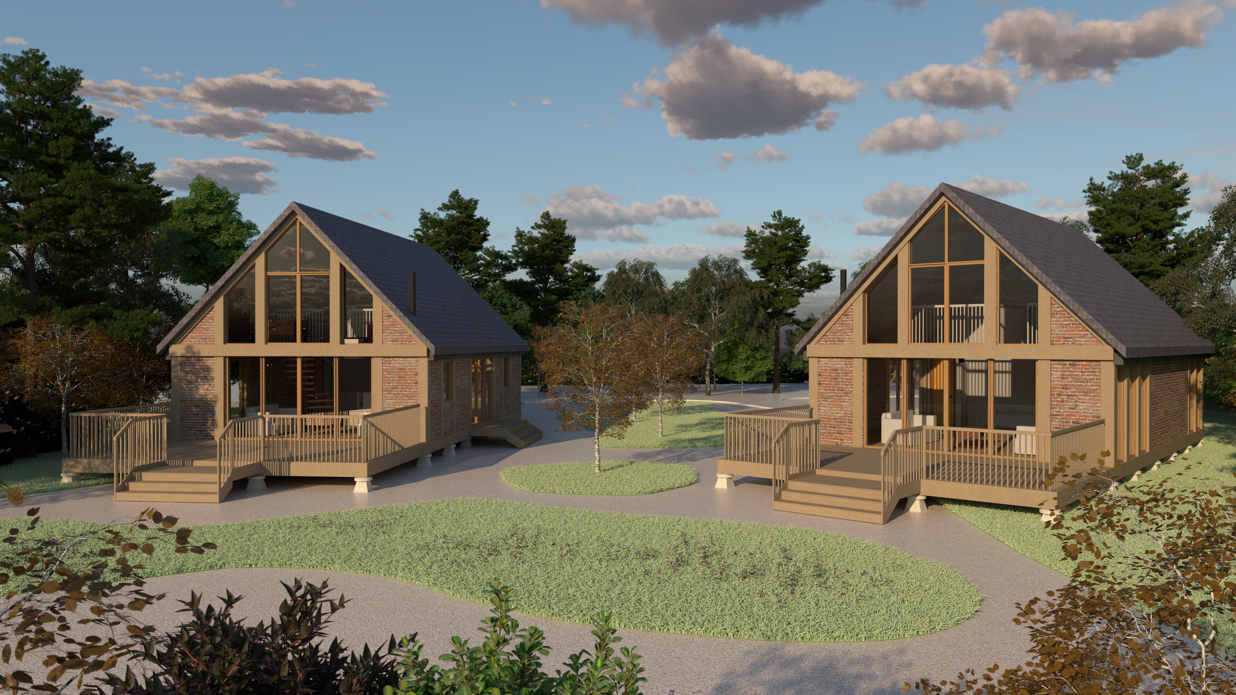 create an architectural render of two staddle stone lodges the lodges are made from brick with timber framing the front facade of each lodge has glazing between the timber framing with the reflection of the surroundings at the front of both lodges is a timber terrace the staddle stones below each lodge are very small in size surrounding the lodges is soft planting and shrubs with gravel paths in the background is low level trees the lighting is natural with the sun setting and some ambient lighting