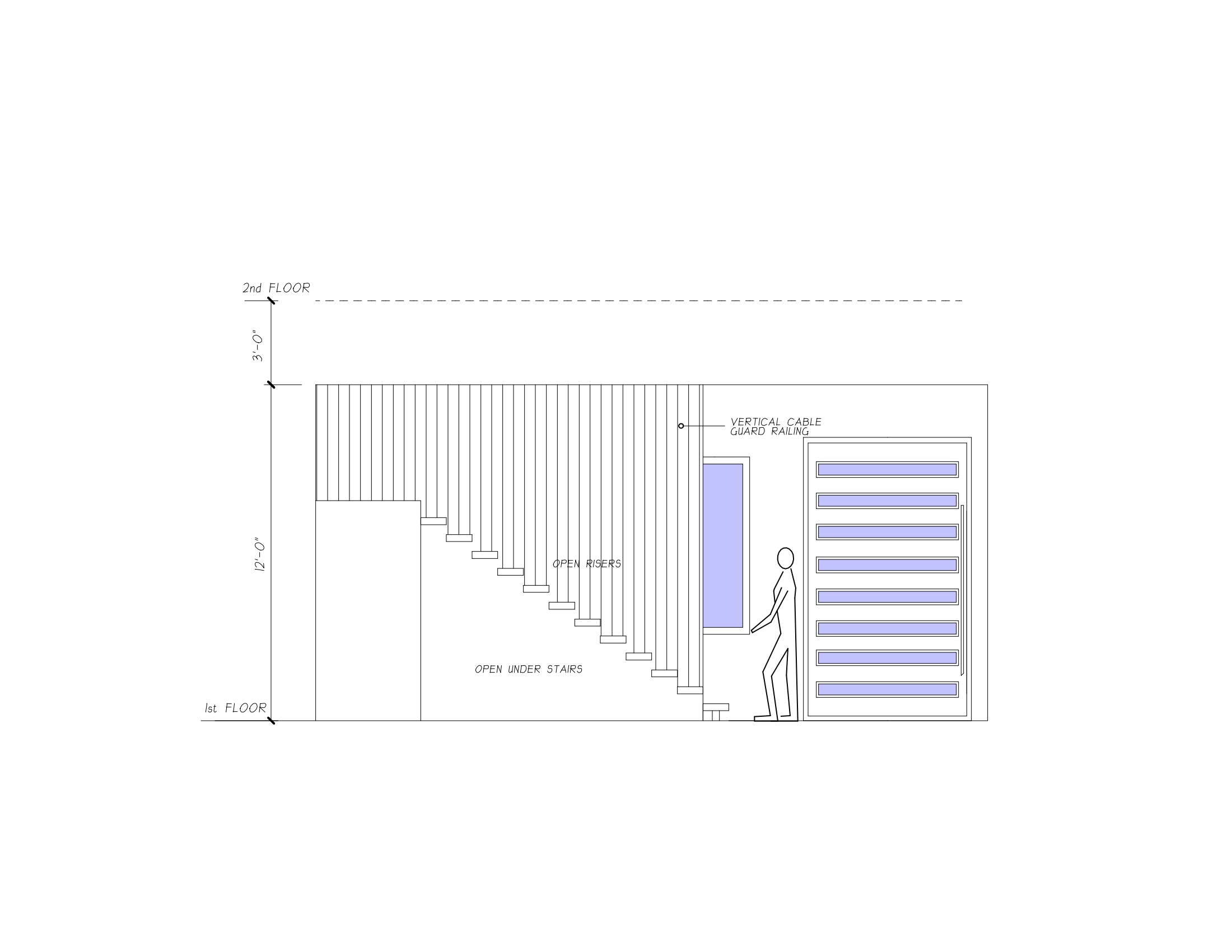 modernist interior shot cantilevered stairs open below with vertical cable railing solid wall under landing entry door and window in wall 10 behind stairs architecture