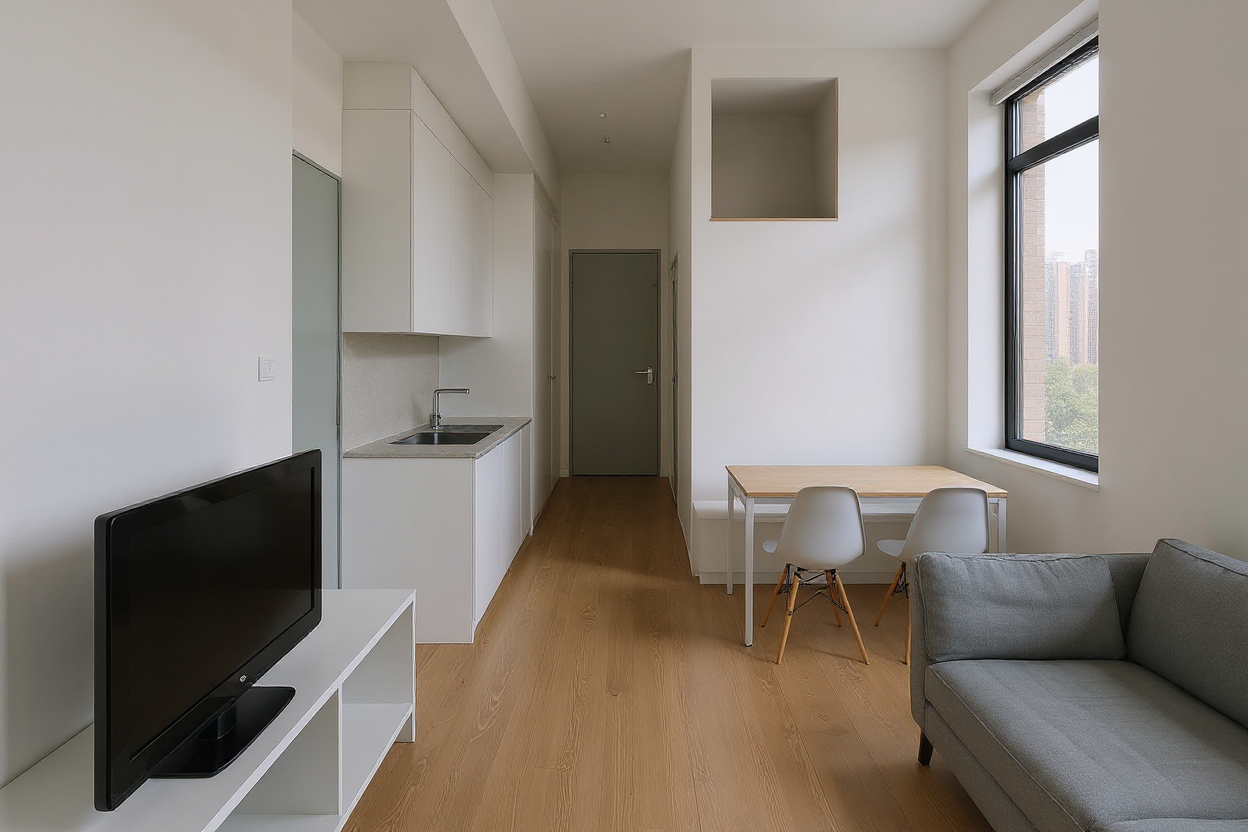 interior shot small apartment white walls grey metall main door the floor is vinyl terracota there is no window the light is coming from the foreground