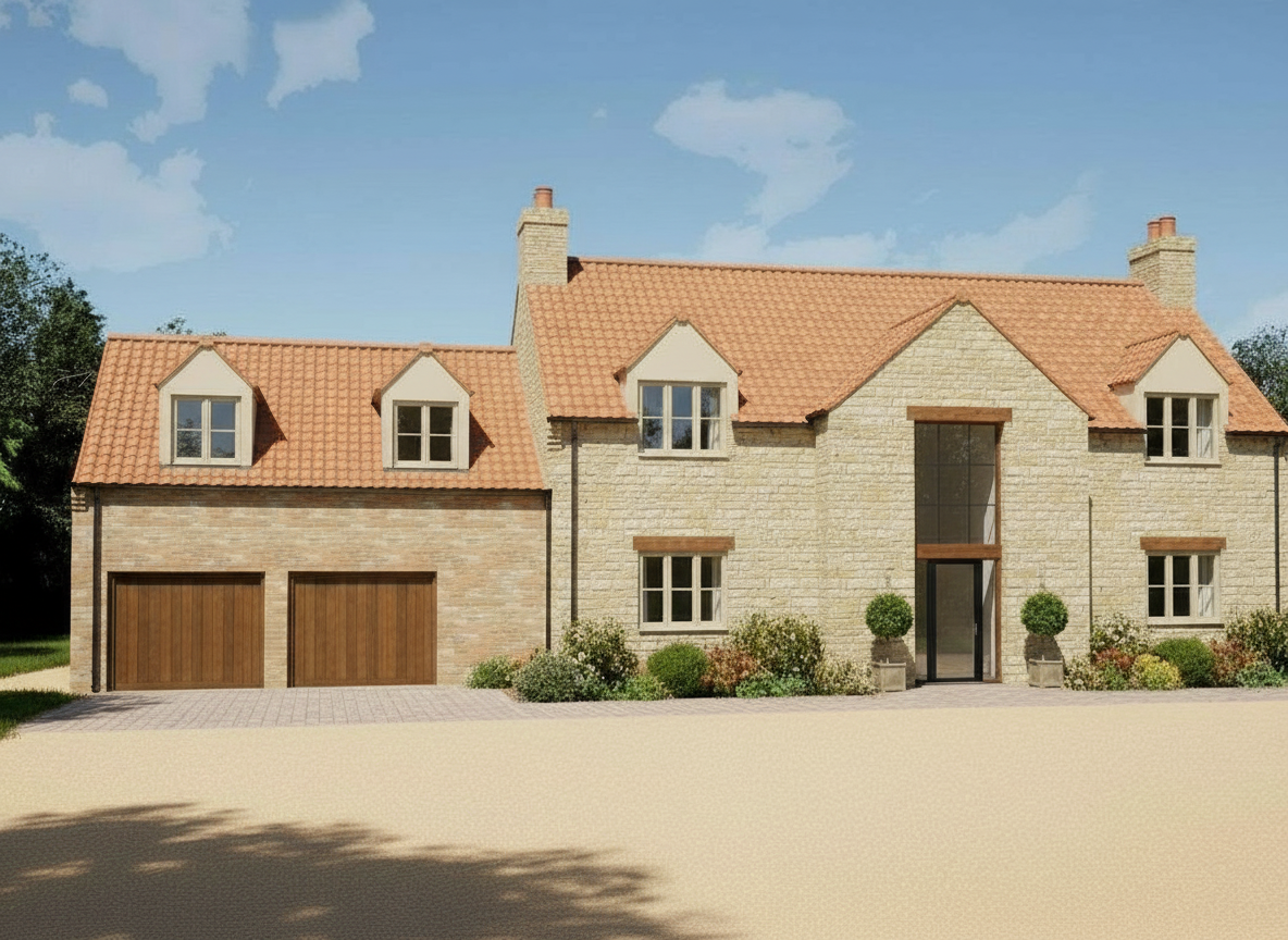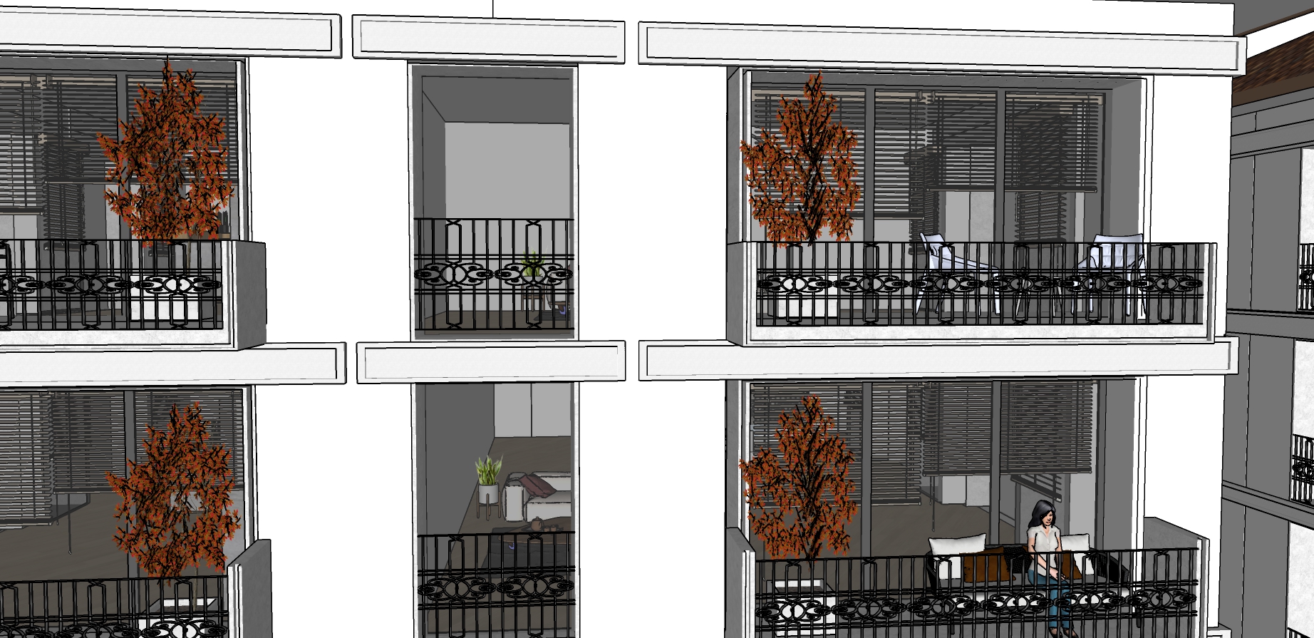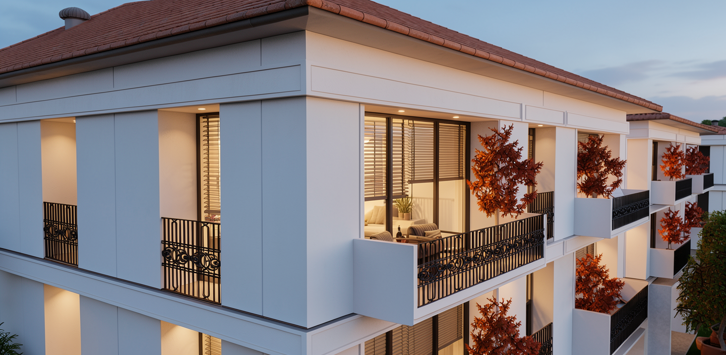 a modern building with a focus on elegance and warmth the building features a sleek minimalist design with smooth white stucco walls the balcony railings are depicted in matte black wrought iron with intricate patterns the roof is a warm earthy terracotta brown complementing the architecture leafy trees with rich autumn orange and red tones add contrast and vibrancy soft warm lighting creates a cozy and inviting atmosphere enhancing the natural and architectural beauty of the scene the sky is a soft dusk blue adding depth to the composition