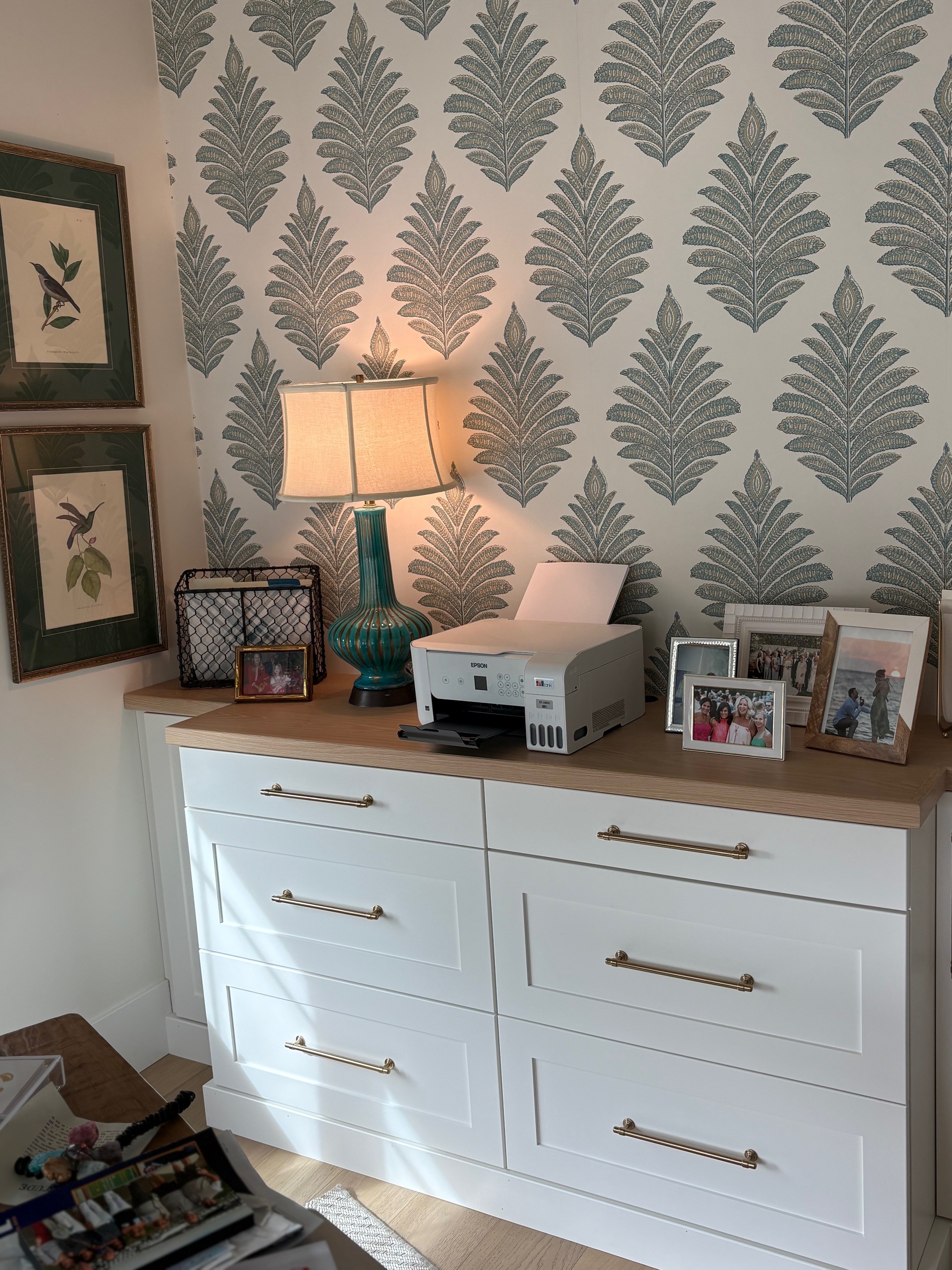 do not change the cabinets in any way preserve the exact cabinet colors materials finishes dimensions door and drawer styles hardware spacing alignment and all geometry exactly as shown do not alter the countertop shape backsplash appliances flooring lighting fixtures or wall structure only remove the construction materials clutter and mess from the scene clean the room and make it look finished and staged add a few simple tasteful home accessories appropriate for the style of the space but do not add or remove any furniture windows or architectural elements maintain the original lighting direction and realism enhance clarity and polish the photo while keeping the cabinetry and room design completely unchanged do not alter the lighting to keep the cabinet colors as they are in the image restage the countertop and floor for an office