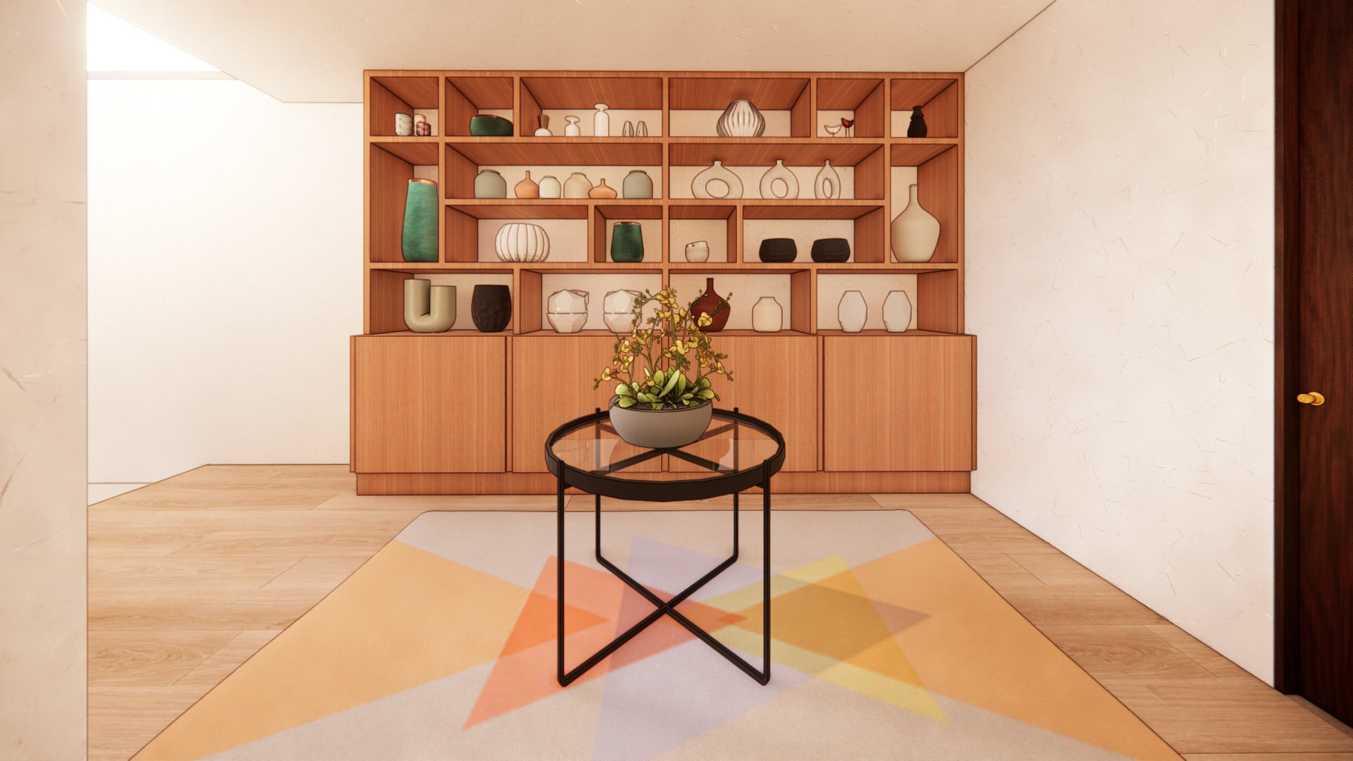 mprove this collection display room render while keeping the existing furniture and layout enhance textures walls shelves flooring and display materials for a more realistic and high quality appearance add ceiling lighting plafon to brighten the space and highlight the displayed items without adding lighting to the furniture ensure the scene looks lifelike with realistic materials shadows and lighting