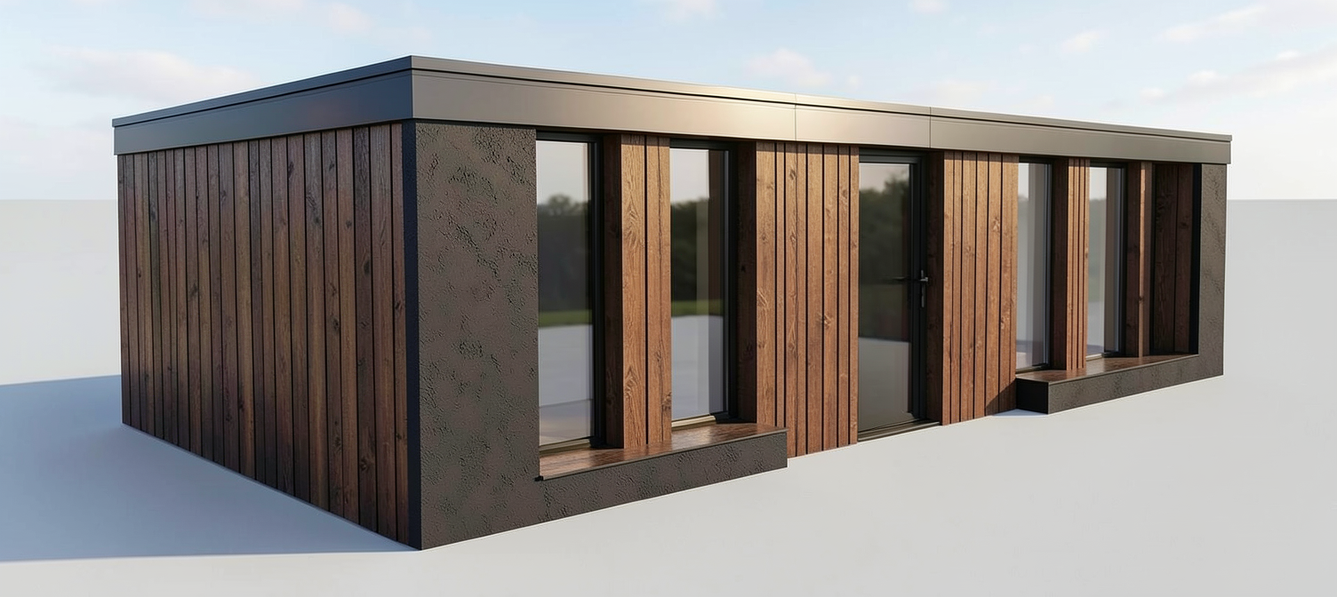 cedar dark cladding with black plaster render to the walls and a pvc fascia board to the edge of the roof windows and doors black frame and clear glass place background into garden and make realistic
