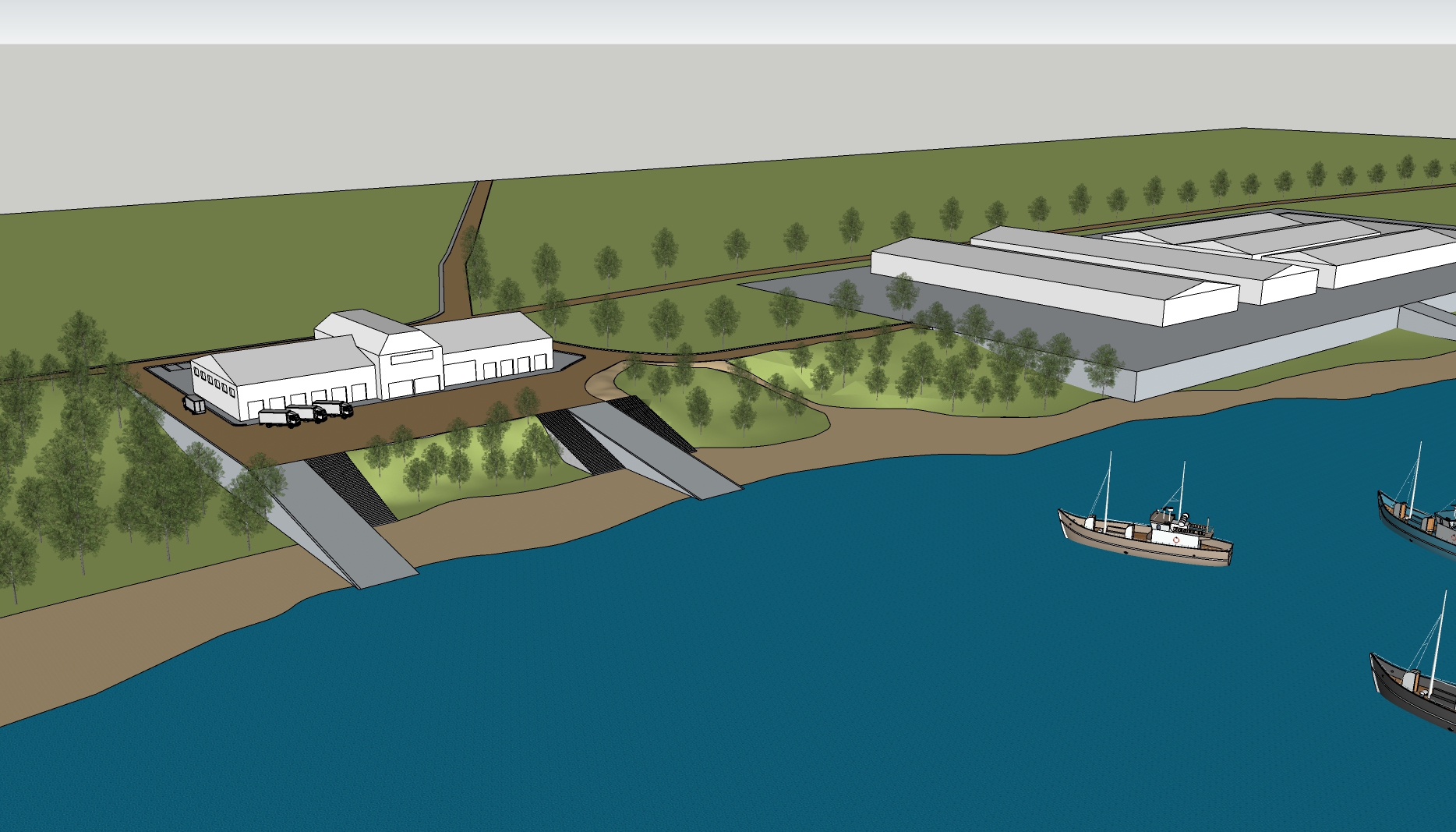 modernist exterior shot enhance and upscale the existing rendering while keeping the original 3d model unchanged extend the background to create a continuous coastal landscape inspired by zanzibar tanzania shallow turquoise water visible seabed gradients sandy shoreline and lush green vegetation along the coast add several small traditional wooden fishing boats scattered across the water with realistic wakes similar to local dhow boats auto generate the missing background behind the model with grass fields tropical trees and natural foliage extending inland add subtle texture and detail only to the left building the designed structure keeping other structures simple maintain a bright tropical daylight atmosphere with crisp aerial perspective and natural ocean reflections architecture