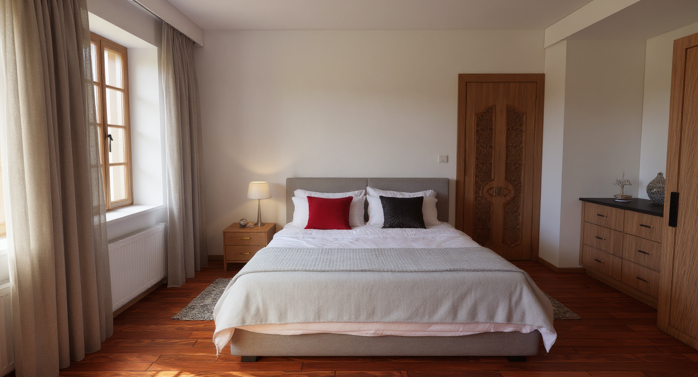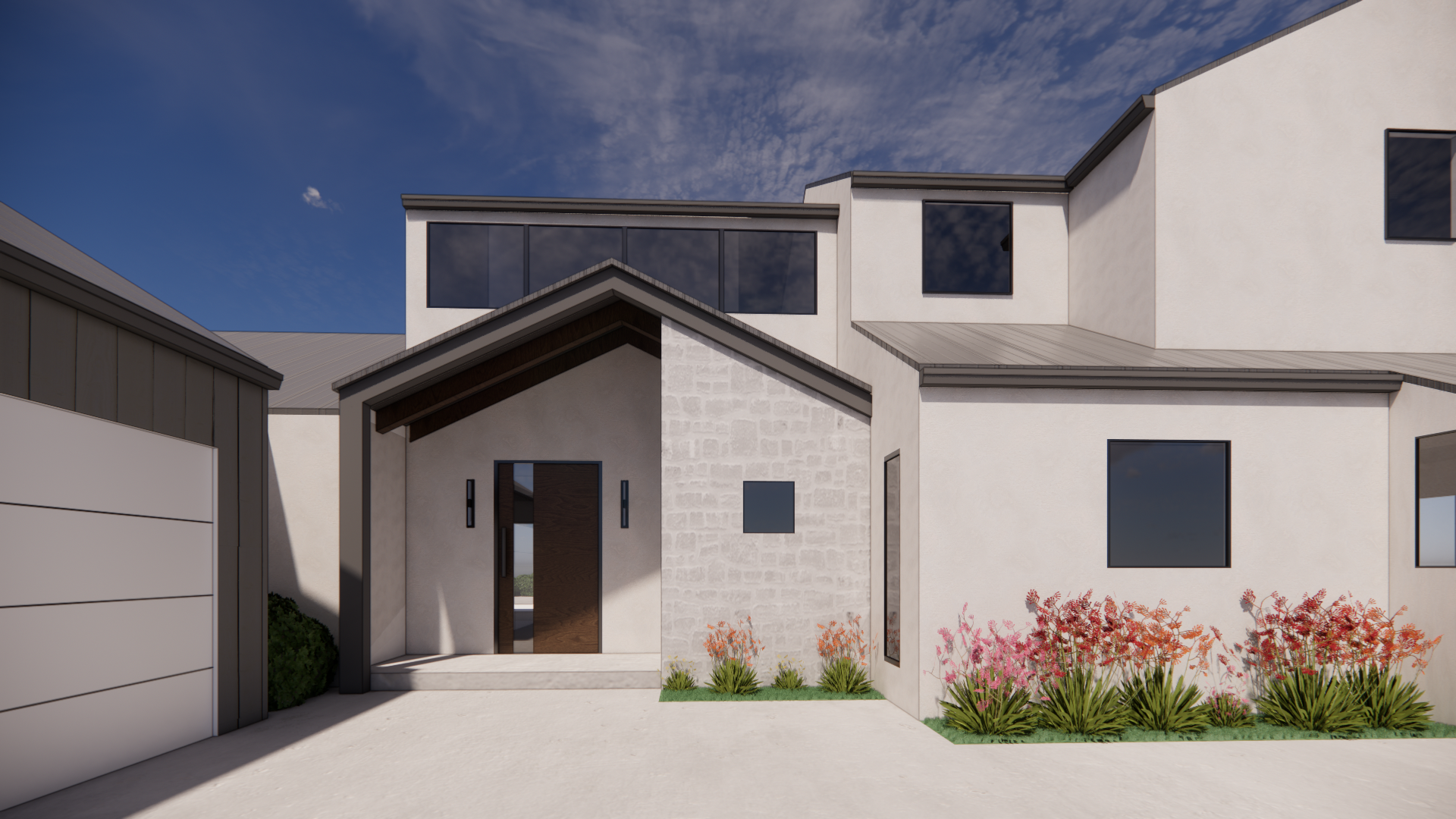 modernist but dramatic exterior shot visualize a modern california style residential building with a contemporary design the building should have white stucco exterior walls and large window with black metal trim with sleek black accents along the edges the atmosphere should be dramatic morning scene sunshine light casting soft shadows the surrounding landscape should include lush green shrubs and tall deciduous trees with autumn colored leaves architecture wall sconce at the entrance casting sunlight
