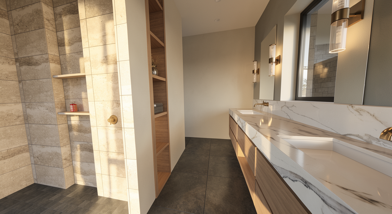 kitchen cabinetry is teddwood cabinetry rift cut white oak with sand finish countertops are bella pietra pompeii stone make as realistic as possible soft daytime lighting and hood with a cream limewash finish do not add stools to main island