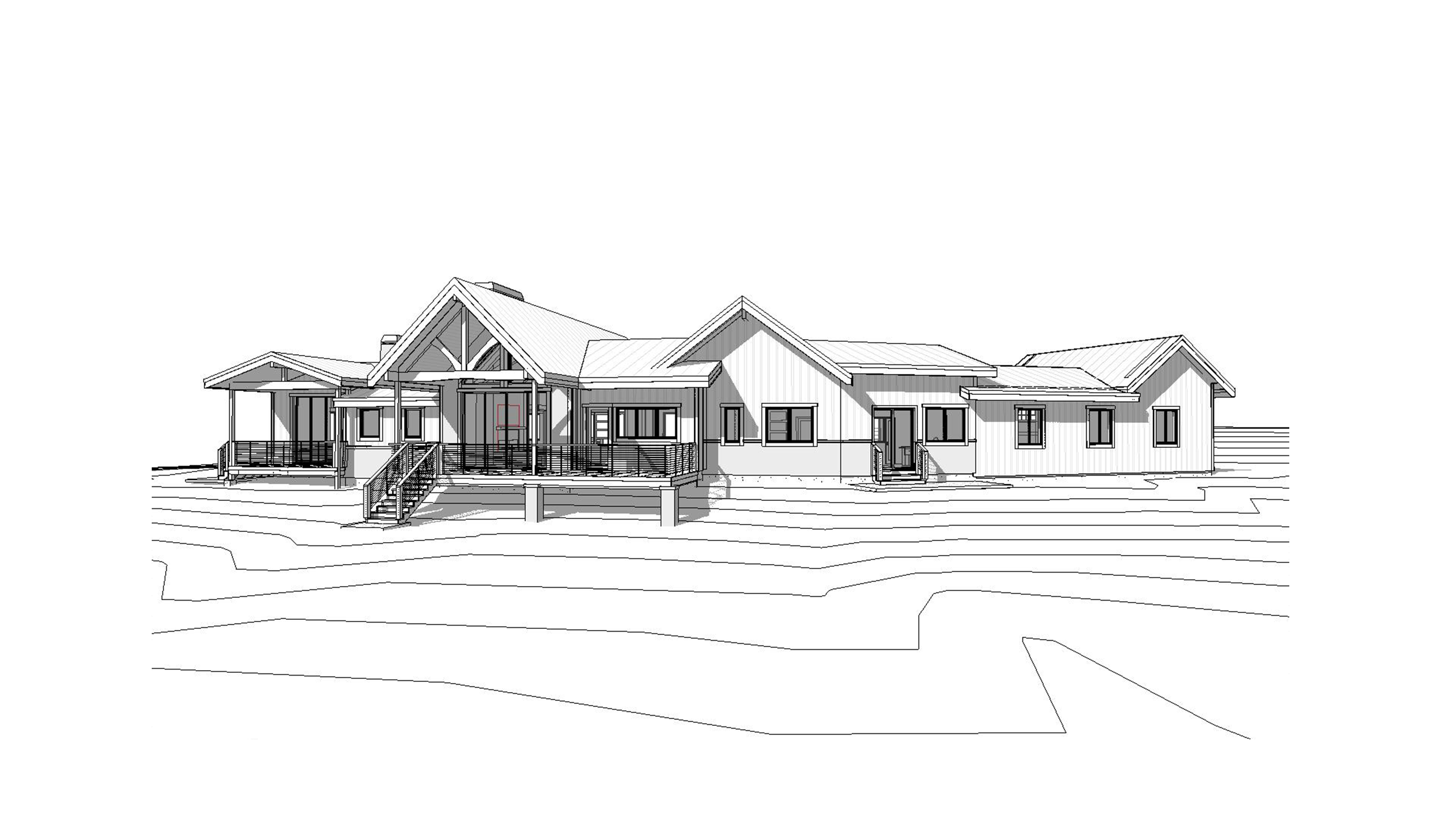 rear view of a clean mountain modern architectural exterior rendered in cinematic vibrant dusk lighting with vibrant colorful skies heavy timber architectural style vertical select grade cedar siding with warm wood accents manicured landscaping around structure with hedges black standing seam metal roof prominent cinematic snow capped mountains and douglas fir trees surrounding the house in the background high fidelity photorealistic visualization crisp shadow falloff refined facade geometry soft atmospheric depth premium architectural photography mood ultra clean composition and materials black window trim black roof trim concrete driveway leading up to the garage doors black garage doors photorealistic render
