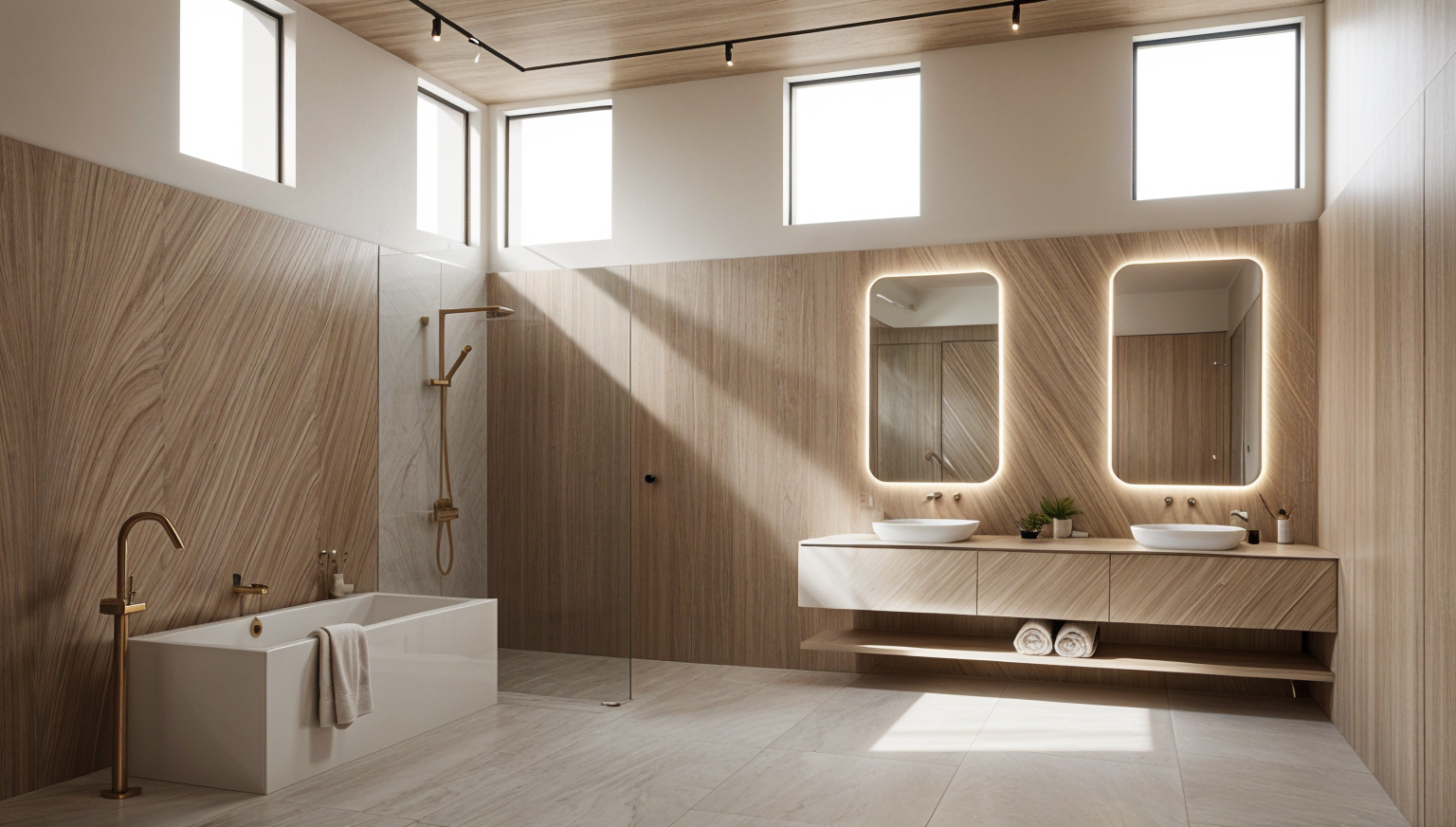 international style wide angle shot keep the exact camera angle distance and perspective from the supplied image do not move the camera or change focal length convert this scene into a photoreal upscale nightclub at night preserve the architecture exposed steel trusses balcony railing stage height and shape wood fascia rigging positions and ceiling element do not modify the structure the stage is flanked on both sides by black velour curtains there is only one led wall centered behind the performers do not add any side led screens the led wall must show one unified abstract motion background no collage no text no logos no photos keep led brightness controlled so it does not overpower the performers add a picture in picture imag window as a rectangular overlay inside the led wall content as if routed through a switcher imag belongs only on the led wall do not create any other screens the audience area in front of the stage is a sunken dance floor lower than the surrounding level the perimeter platforms and walkways are higher preserve this elevation change fill the venue with a densely seated audience arranged in upscale lounge groupings seating should be 4 top and round configurations with premium materials such as tufted leather velvet dark wood and brushed metal tables groupings must feel close together and well attended but organized and upscale patrons must face the stage and pay attention to the performers add dramatic concert lighting with visible beams and subtle haze originating from existing truss fixtures use polished concrete floors with soft reflections overall mood is modern exclusive energetic and performance driven architecture